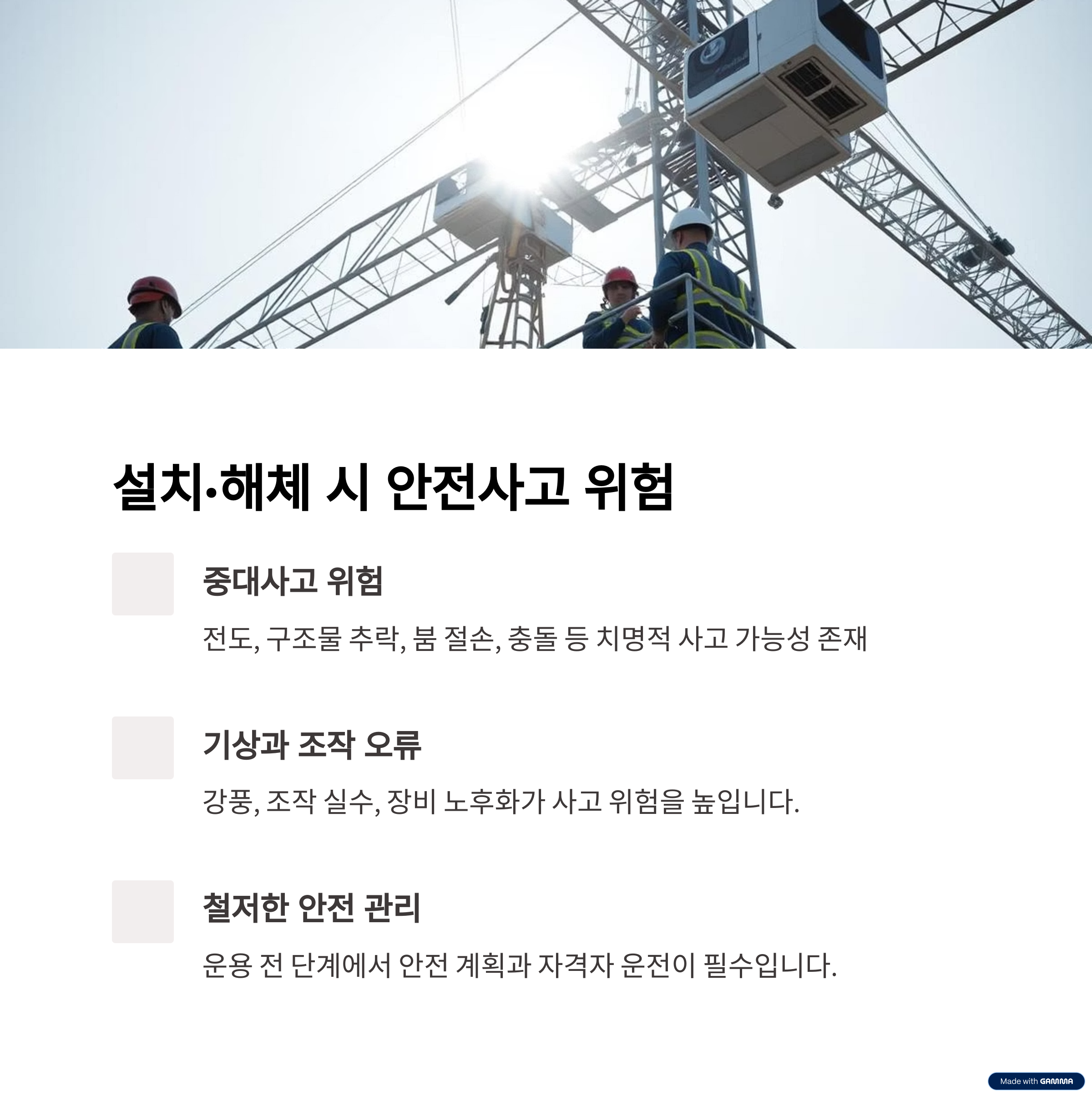 타워크레인의 가장 큰 위험 요소는 설치·해체·상승 작업 중 발생하는 중대사고입니다.
