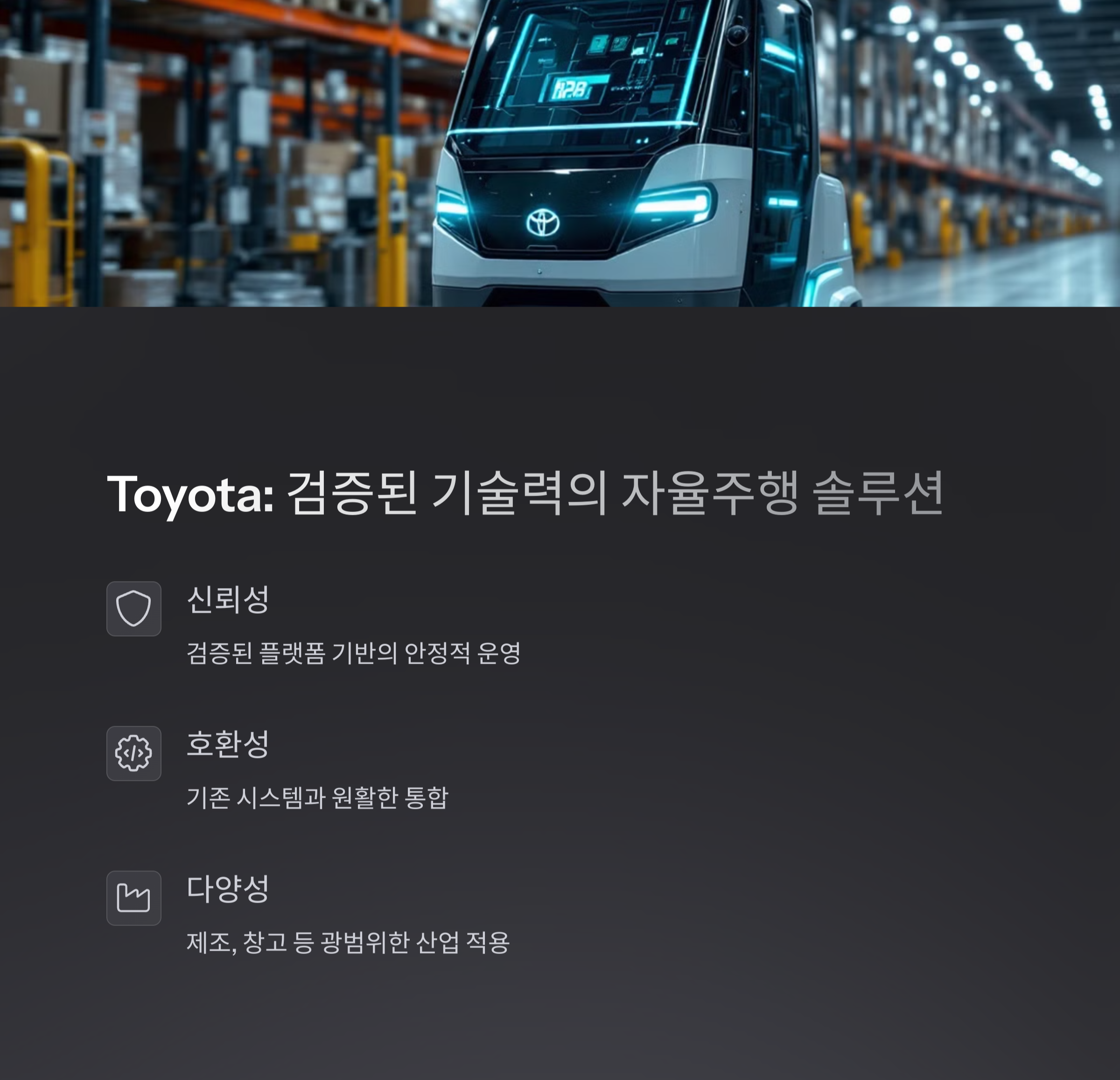 - 내비게이션: Fox Robotics는 자연 특징 기반 내비게이션을, Toyota는 LiDAR 기반 접근 방식을 채택