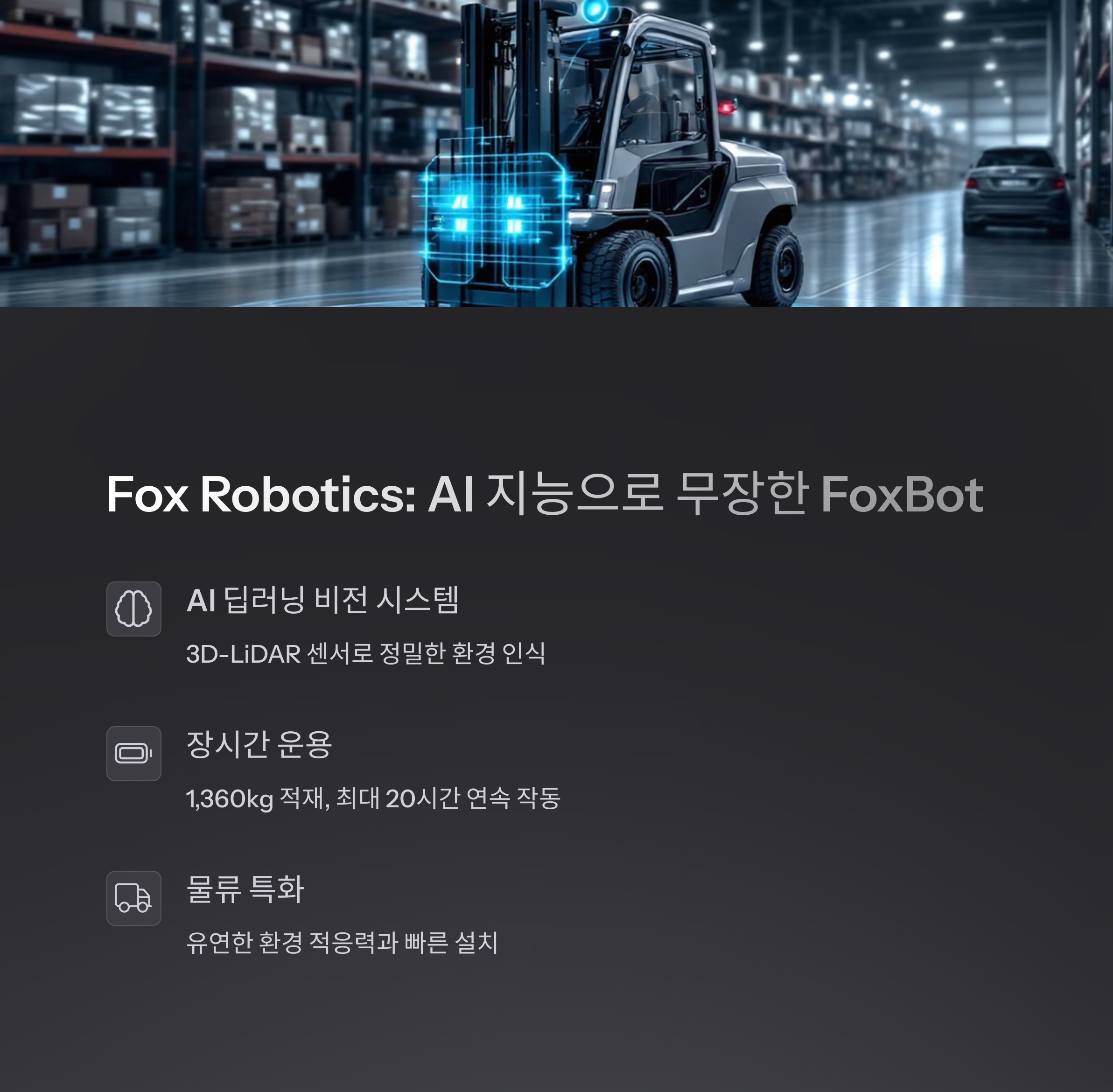 • Fox Robotics: AI와 딥러닝 기반의 비전 시스템으로 복잡한 환경에서도 안정적인 작동