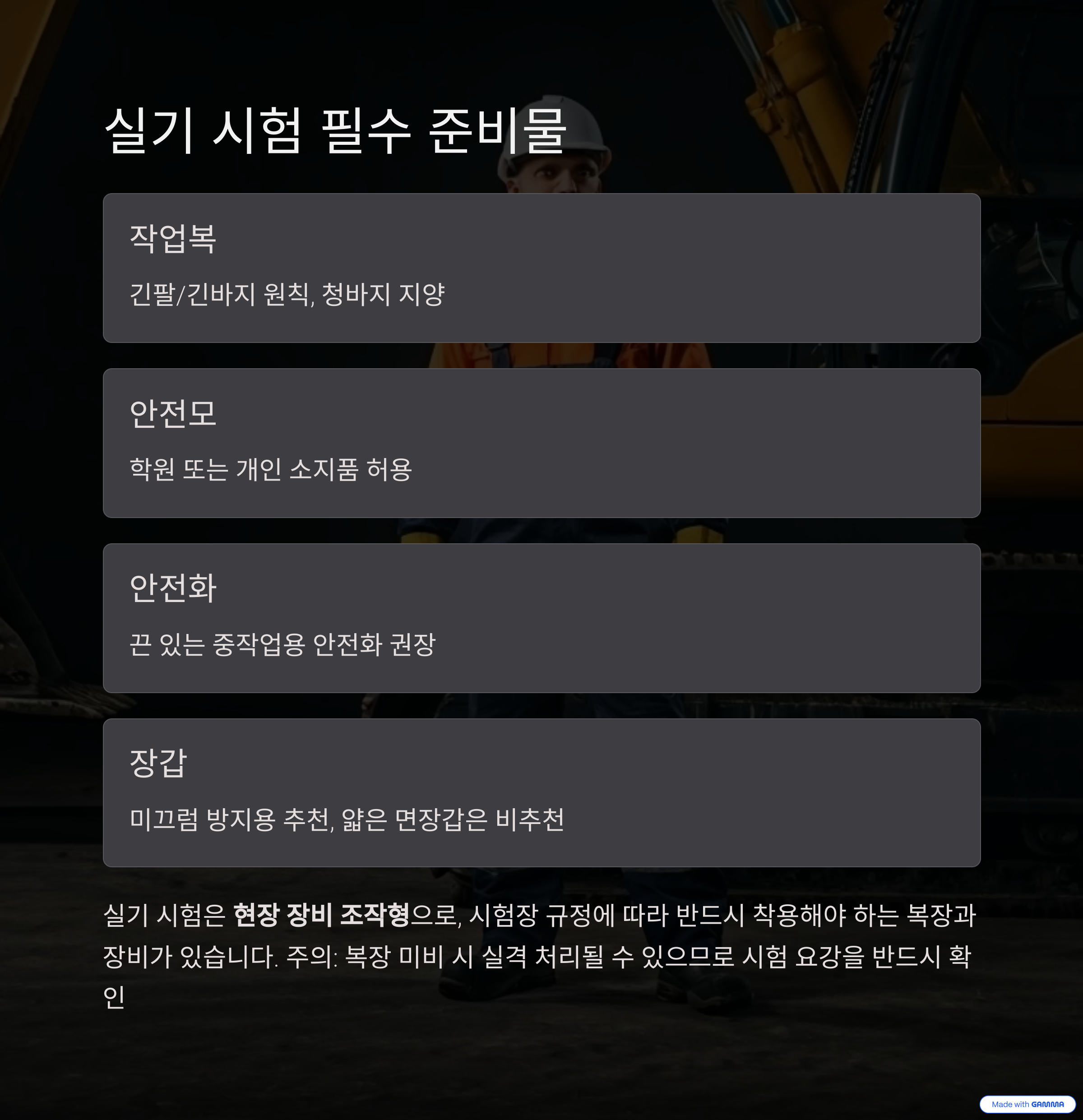 복장(안전화, 장갑 등)은 개인이 준비해야 합니다. - 시험장마다 장비가 상이하므로 사전 시험장 위치 및 장비 기종 확인 필수