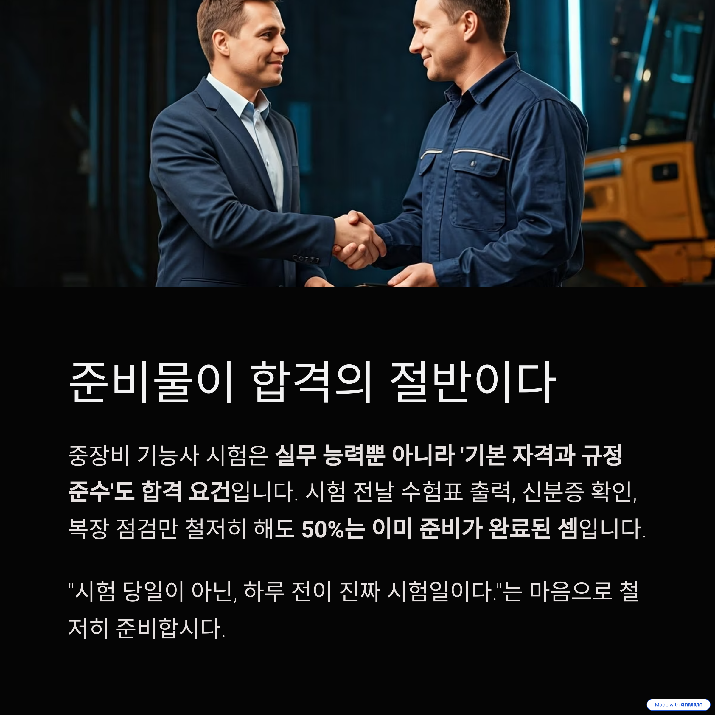 중장비 기능사 시험은 실무 능력뿐 아니라 ‘기본 자격과 규정 준수’도 합격 요건입니다.