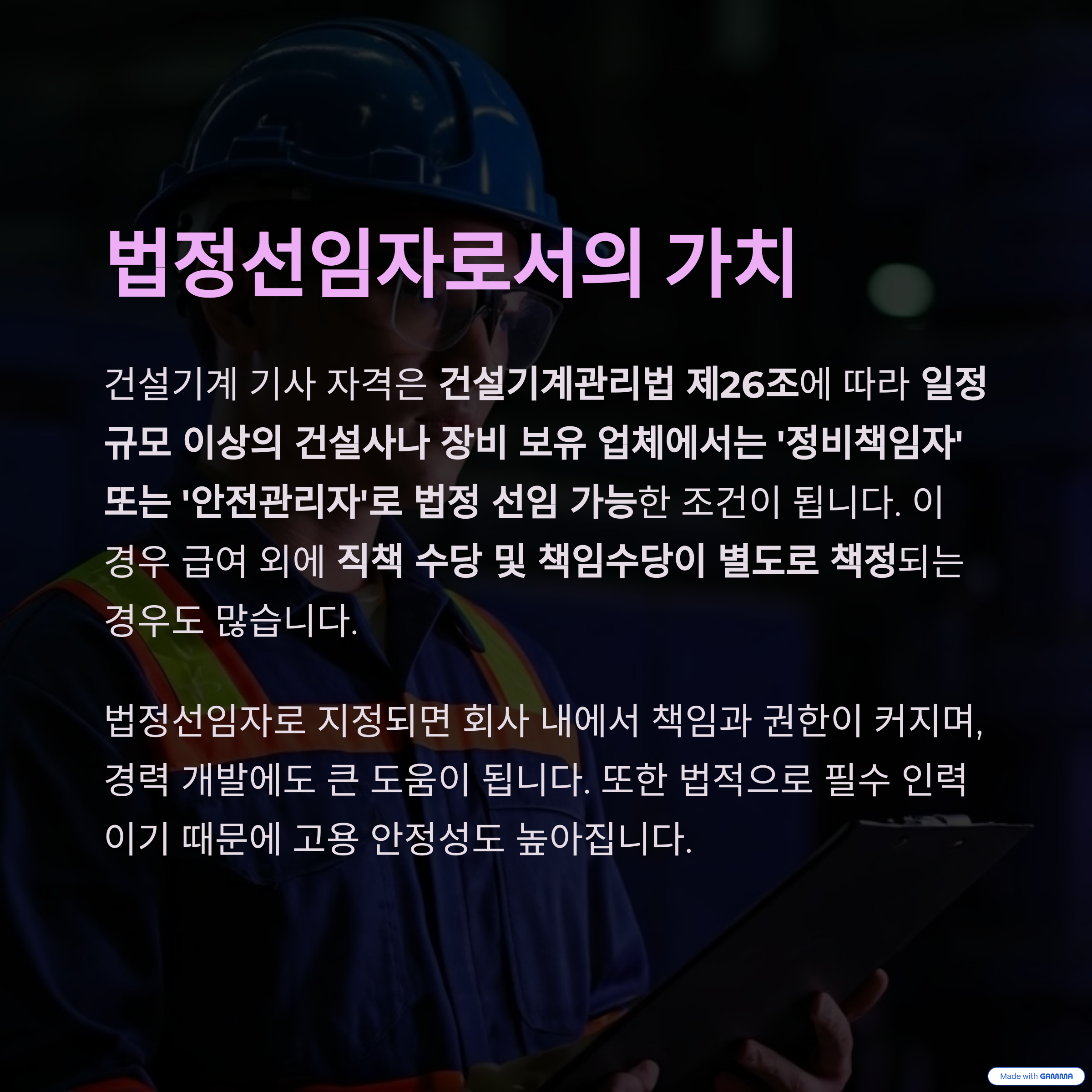 일정 규모 이상의 건설사나 장비 보유 업체에서는 ‘정비책임자’ 또는 ‘안전관리자’로 법정 선임 가능한 조건이 됩니다.