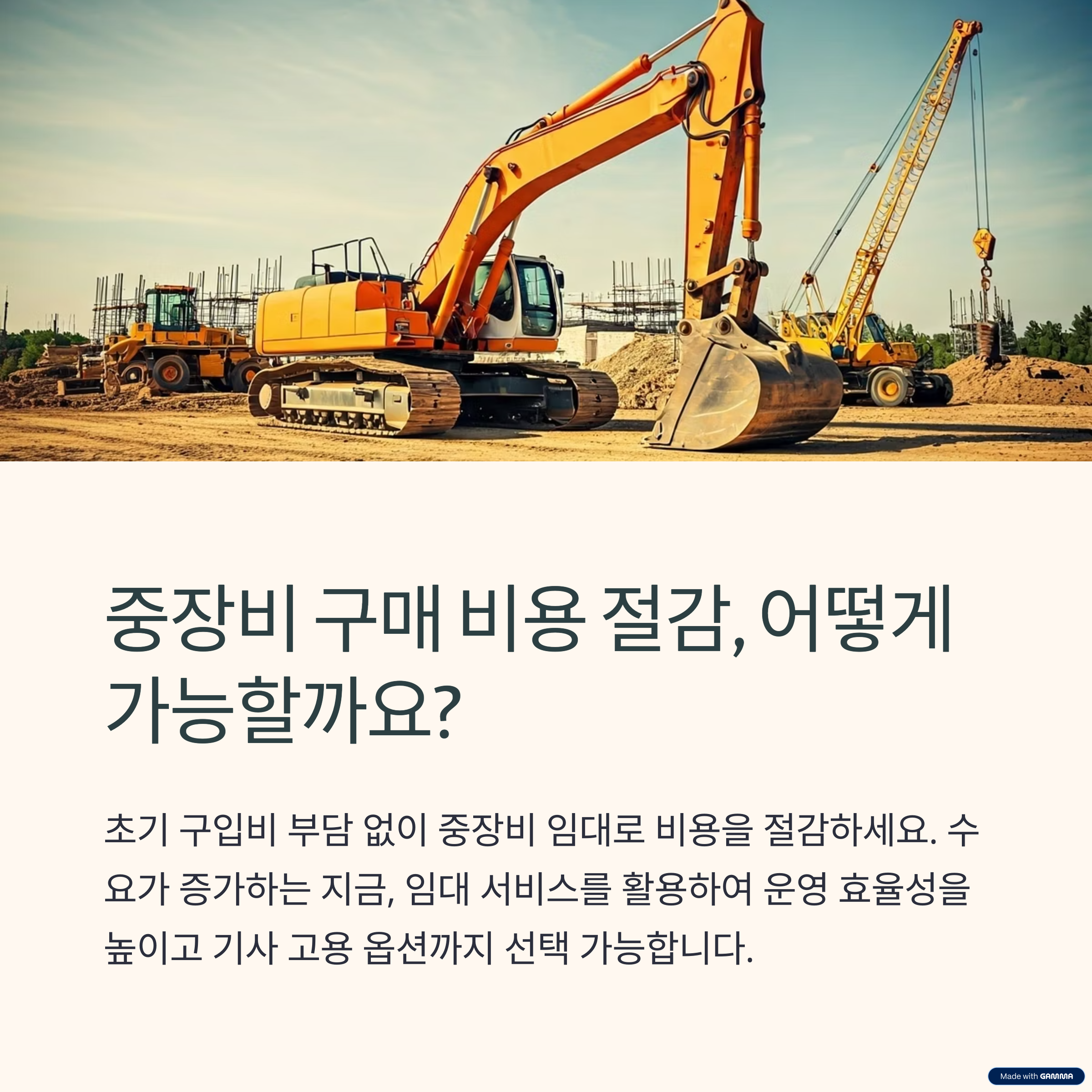 중장비 사용이 필요한 건설 및 공사 현장에서는 장비 구매보다 대여가 경제적입니다.