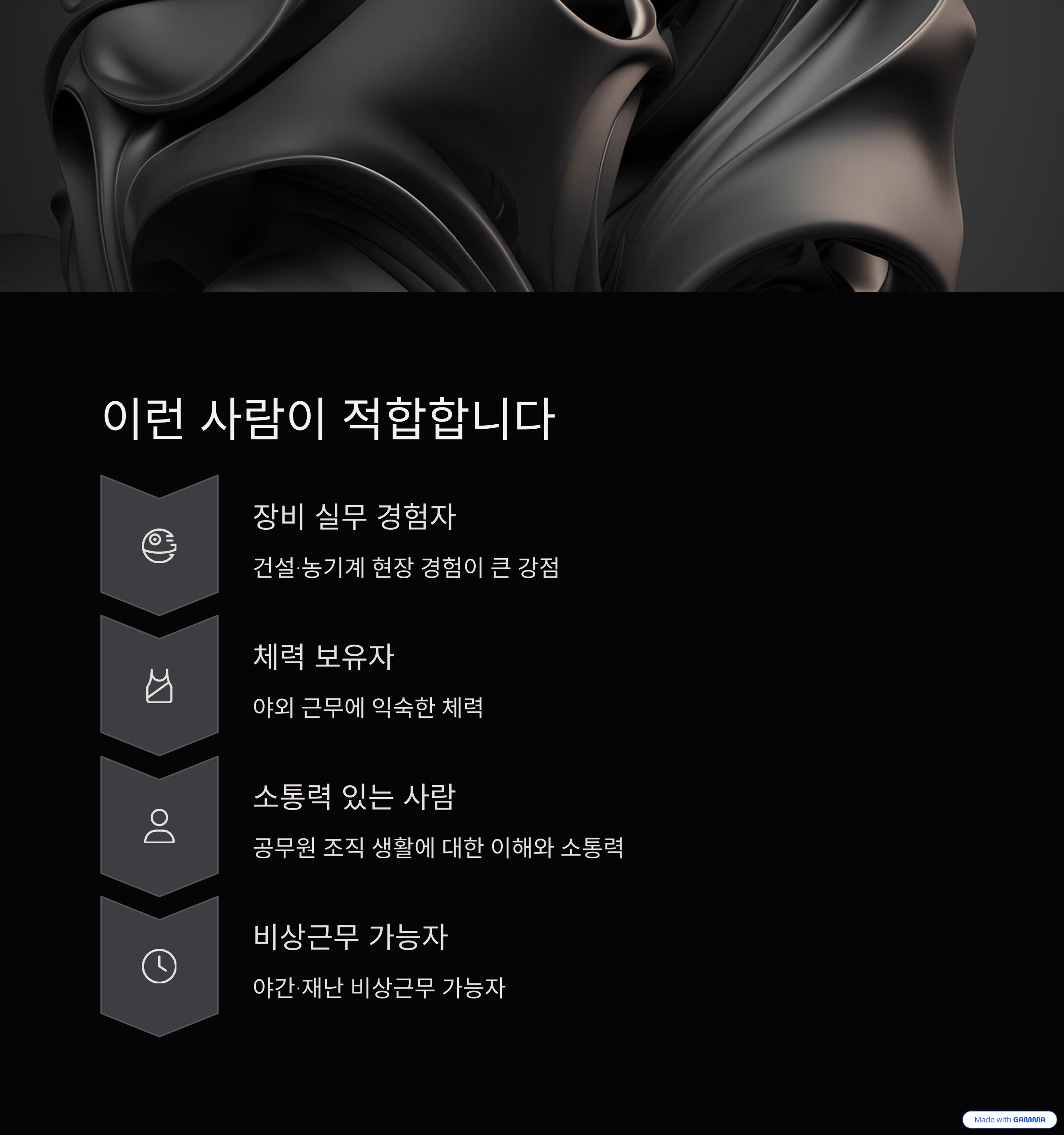 | 특수직계 기능직 공무원 | 경력자 우대 | 해당 장비 조작 실무 경험 |