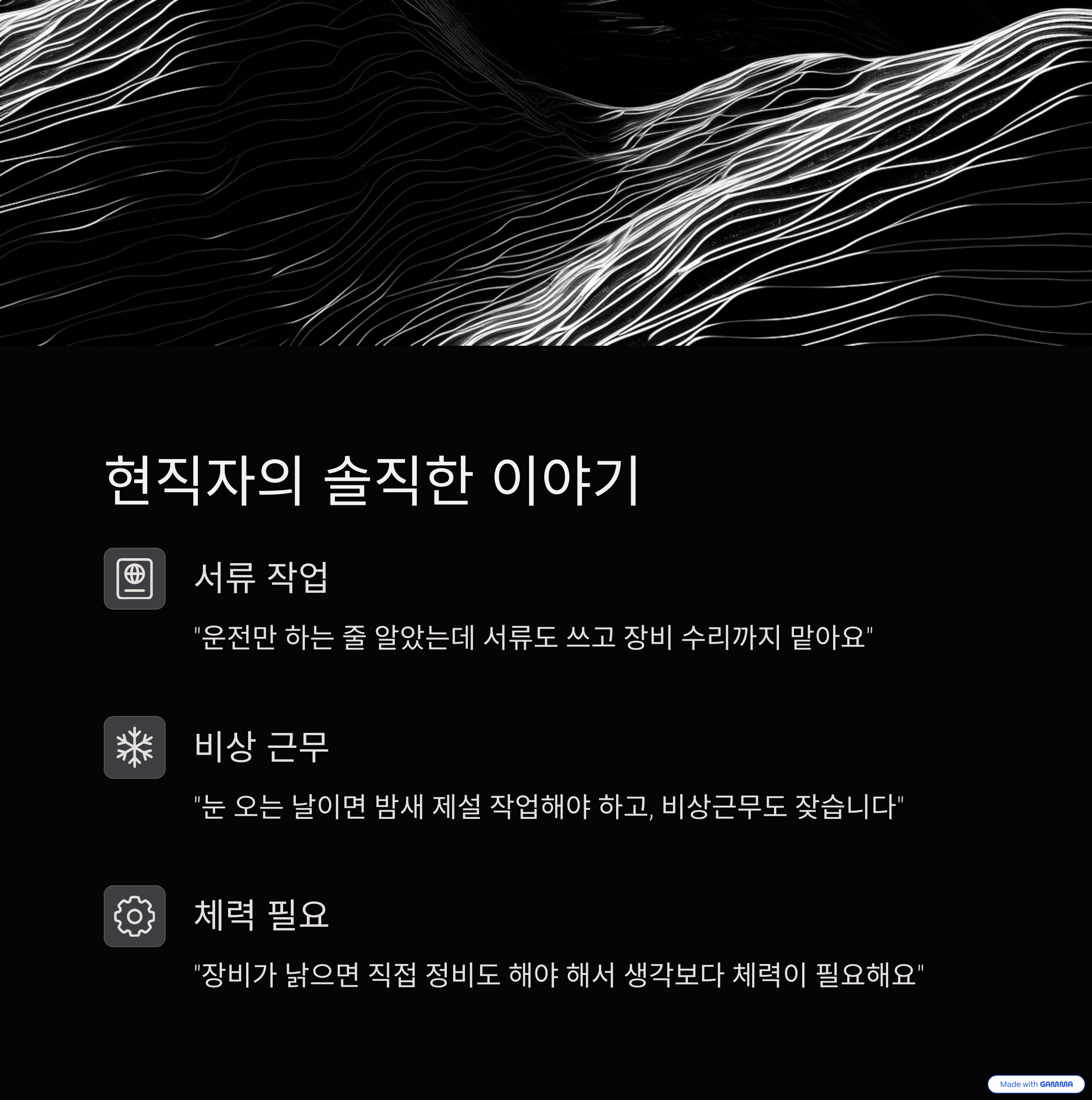 "운전만 하는 줄 알았는데 서류도 쓰고 장비 수리까지 맡아요"