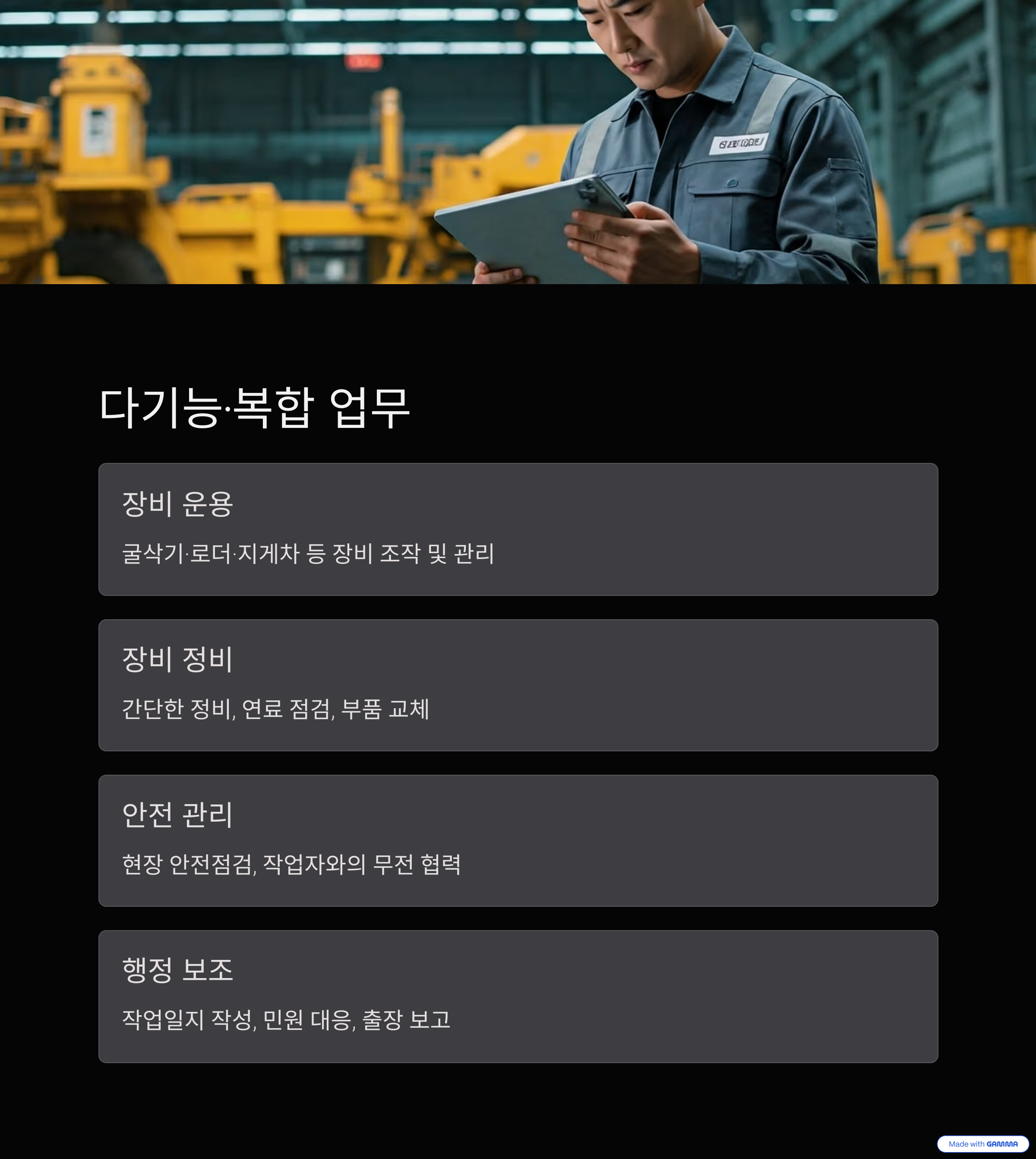 | 장비 운용 | 굴삭기·로더·지게차 등 장비 조작 및 관리 |