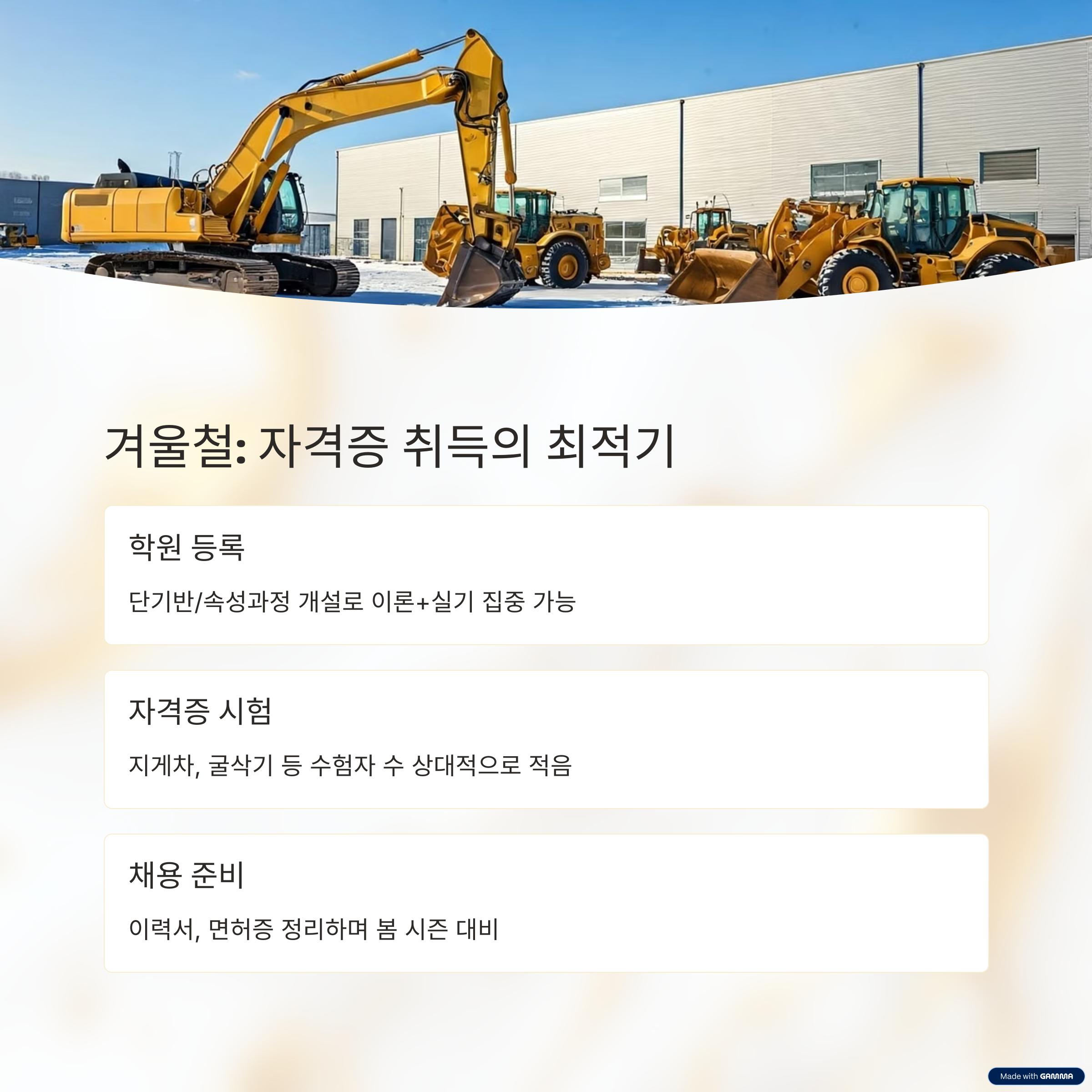 중장비 실무보다는 자격증 준비에 집중하기 좋은 시기입니다.