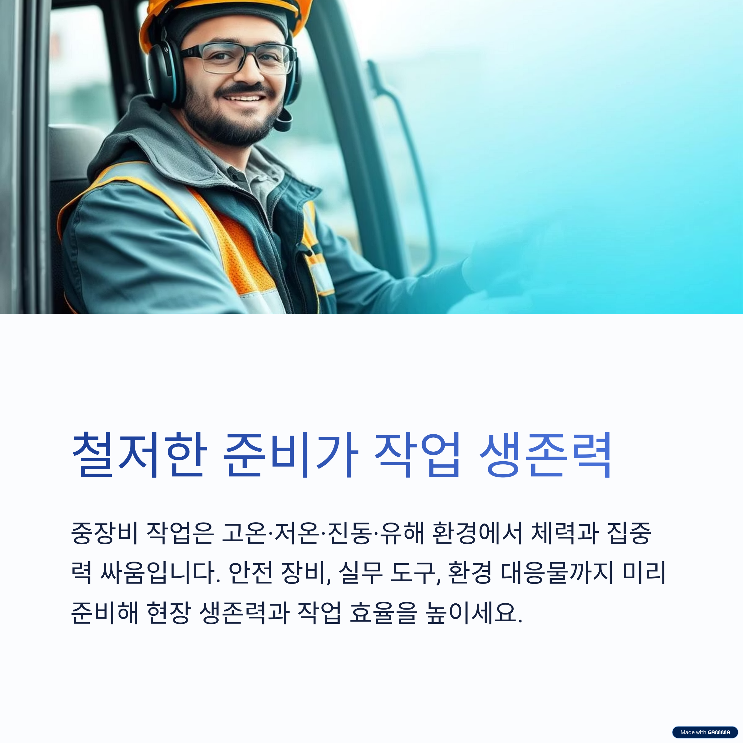 중장비 일은 대부분 실외에서 이뤄지기 때문에 날씨 대비 준비가 필수입니다.