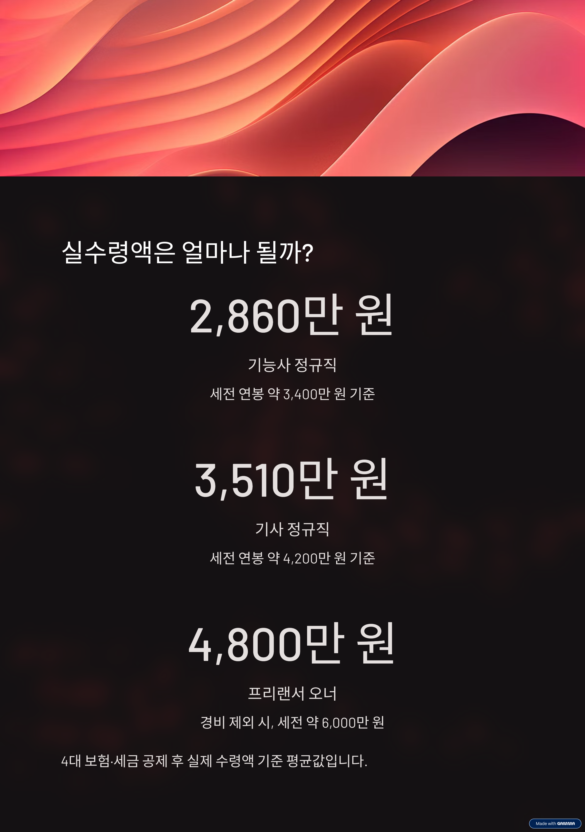 | 프리랜서 오너기사 | 일당 25만 원 이상 | 450만 원 이상 | 5,000만 원~6,000만 원 |