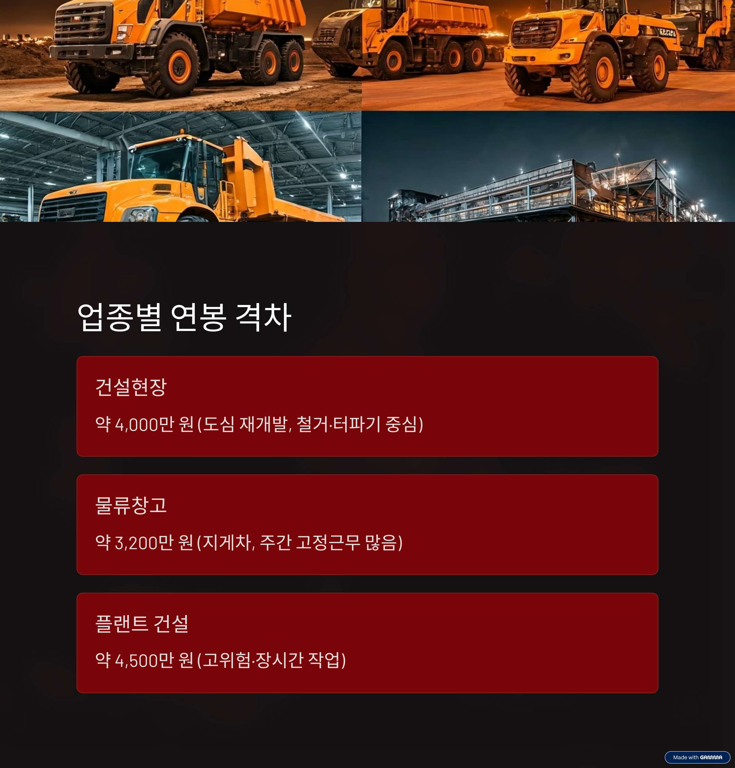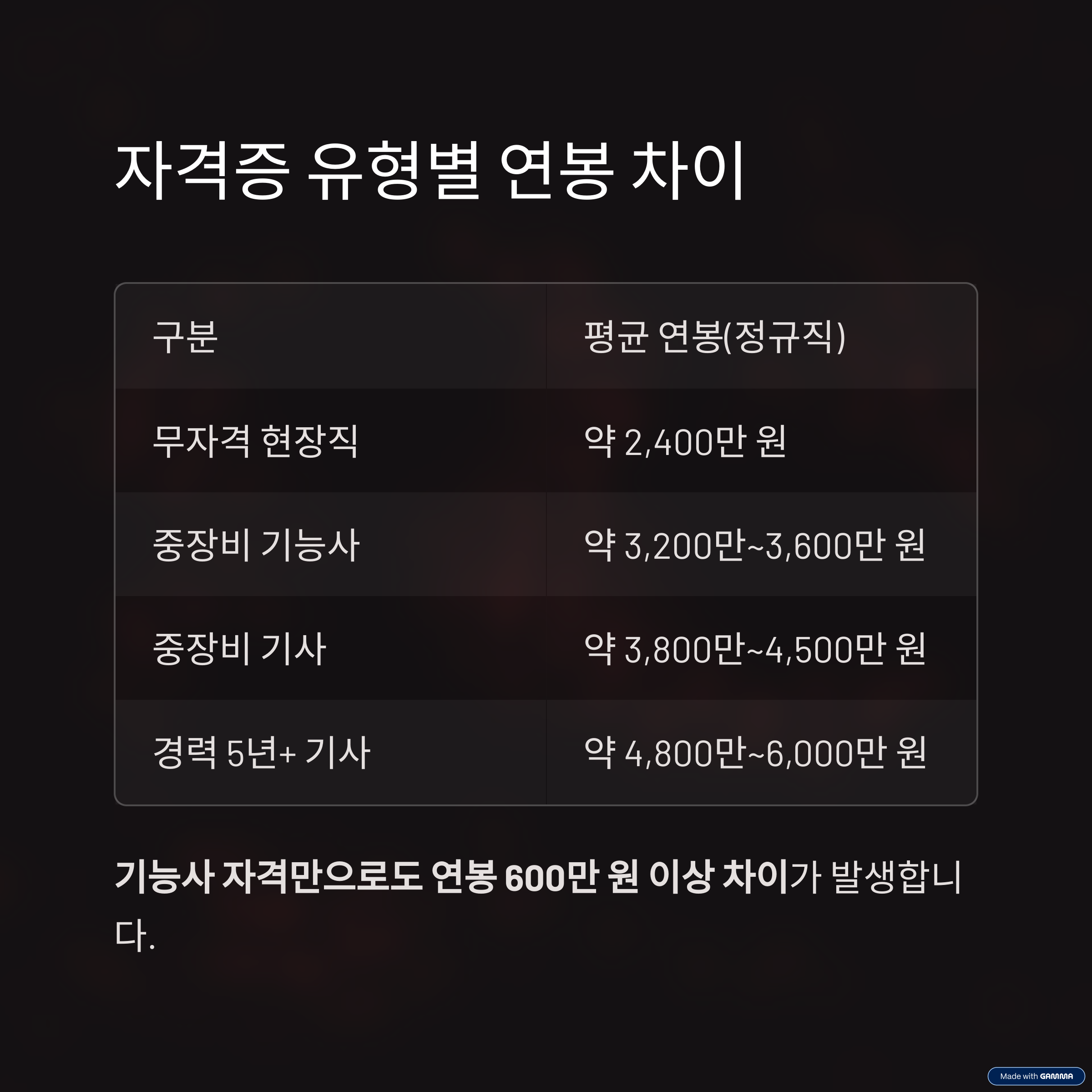 | 중장비 기사 보유 | 설비·정비·관리 | 약 3,800만~4,500만 원 | 중간 관리자급 |