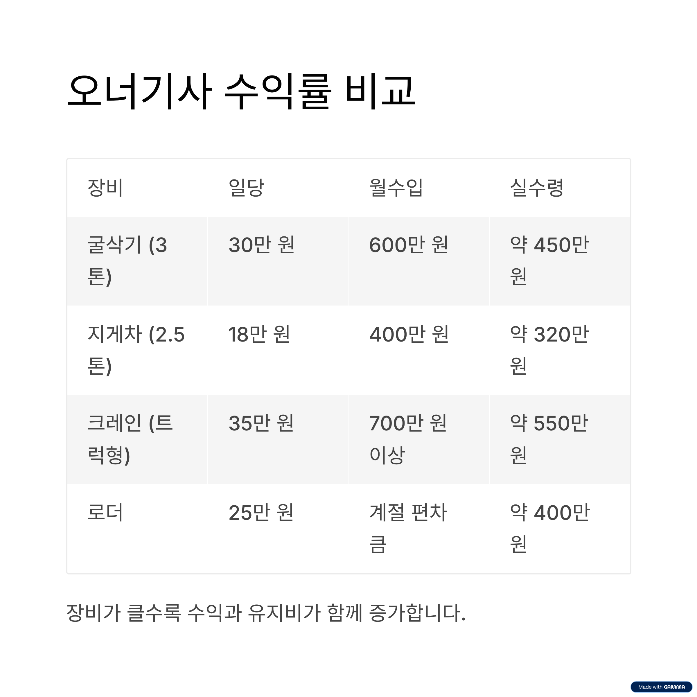 - 장비 감가 부담 있음: 오너 기사라면 수익에서 정비비, 감가 차감 필요