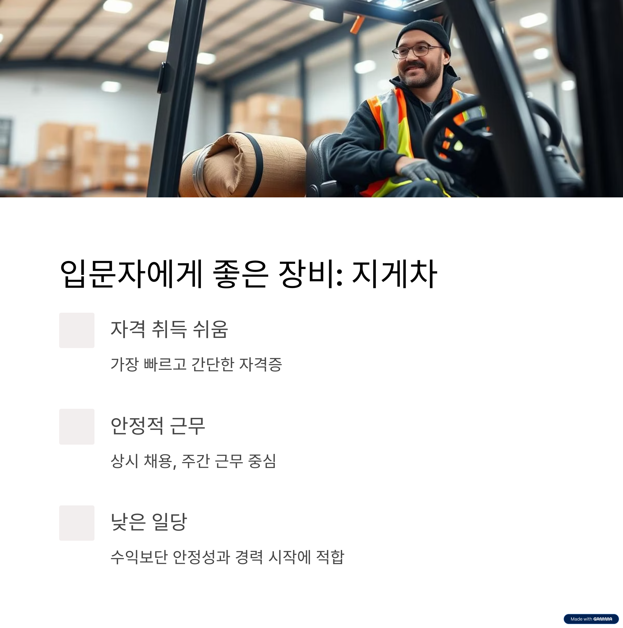 지게차는 수익보단 안정성과 경력 시작에 적합합니다.
