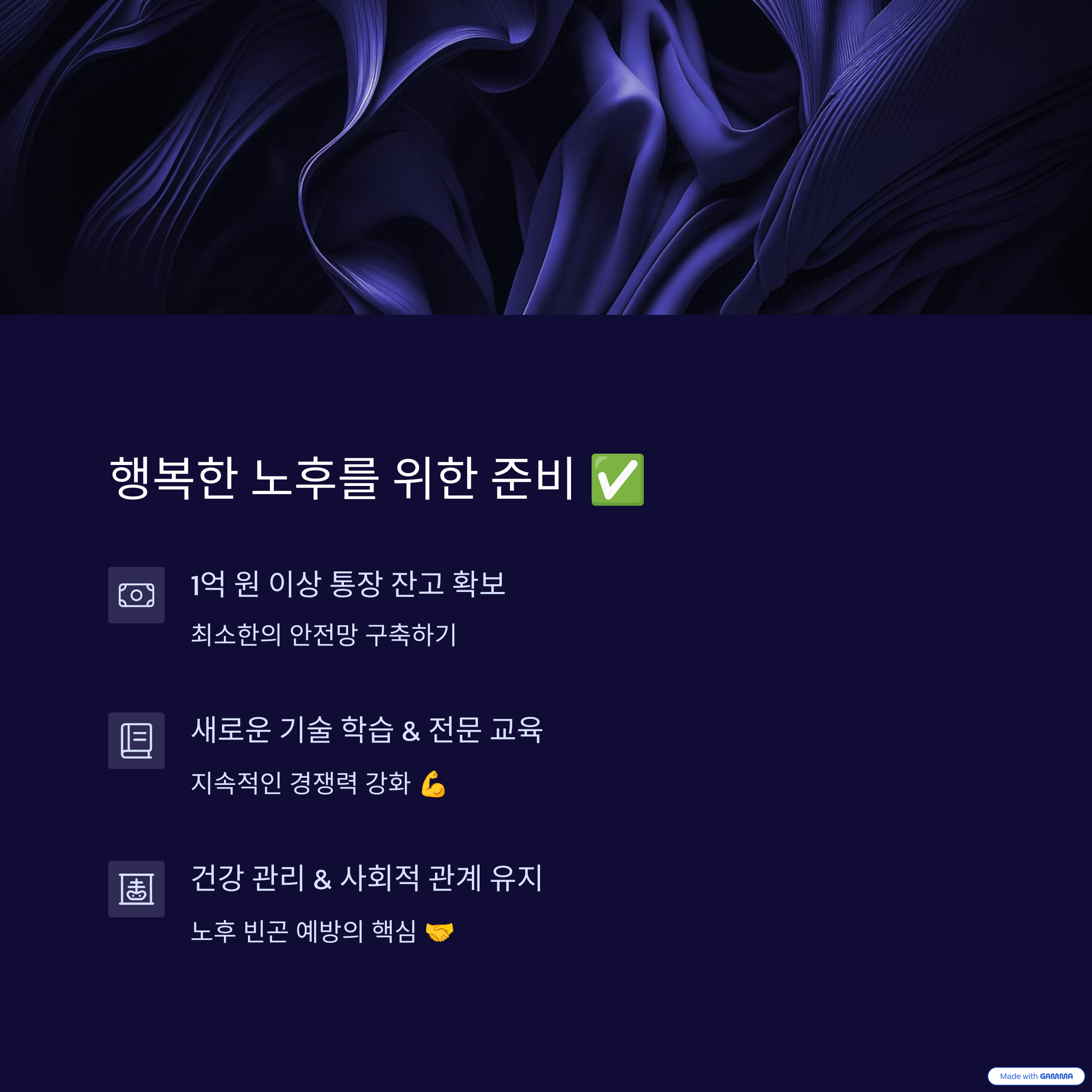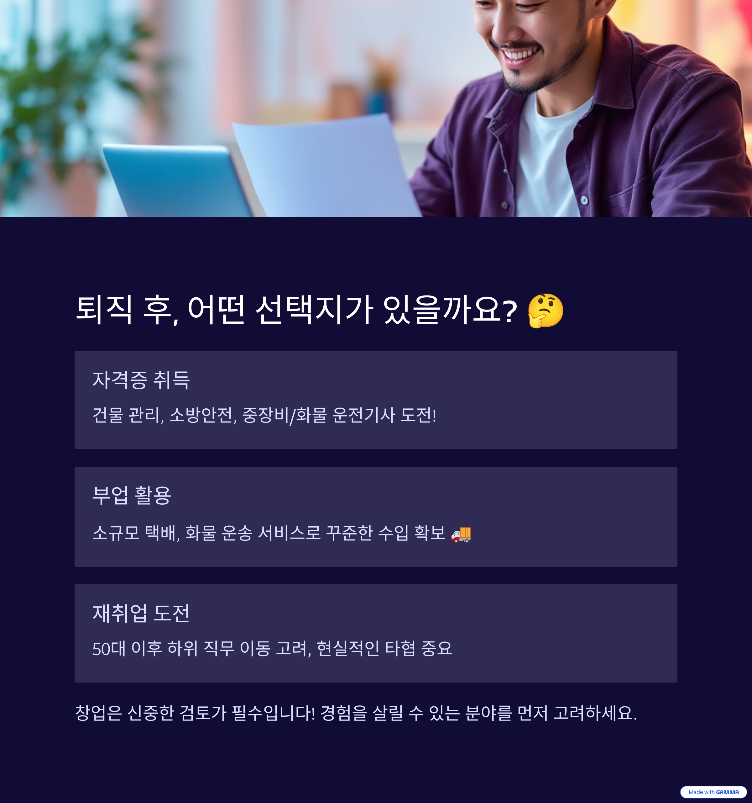 퇴직 후 진로 계획은 경제적 안정을 전제로 이루어져야 합니다.