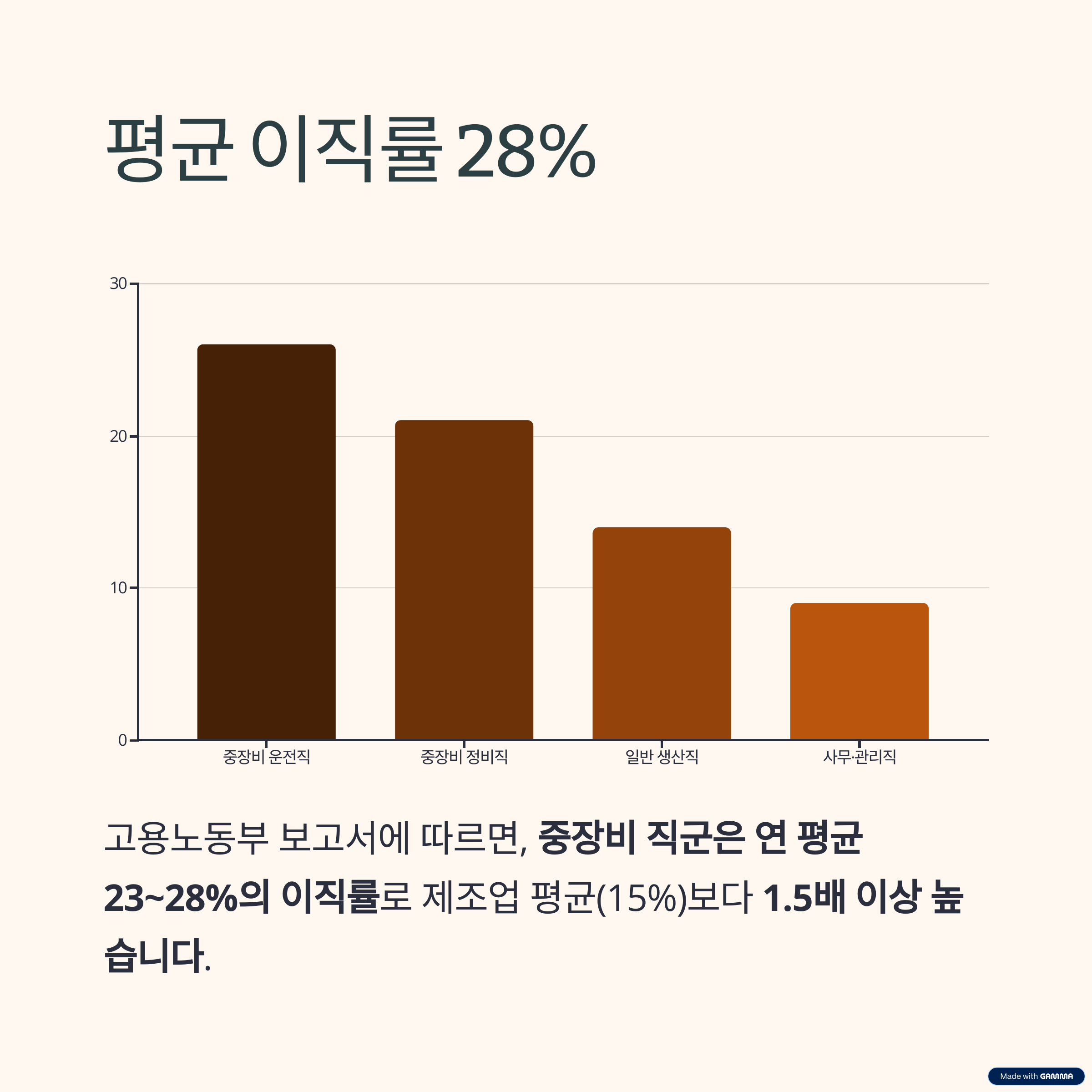 중장비 운전·정비 직군은 연 평균 23~28%의 이직률을 기록하고 있습니다.