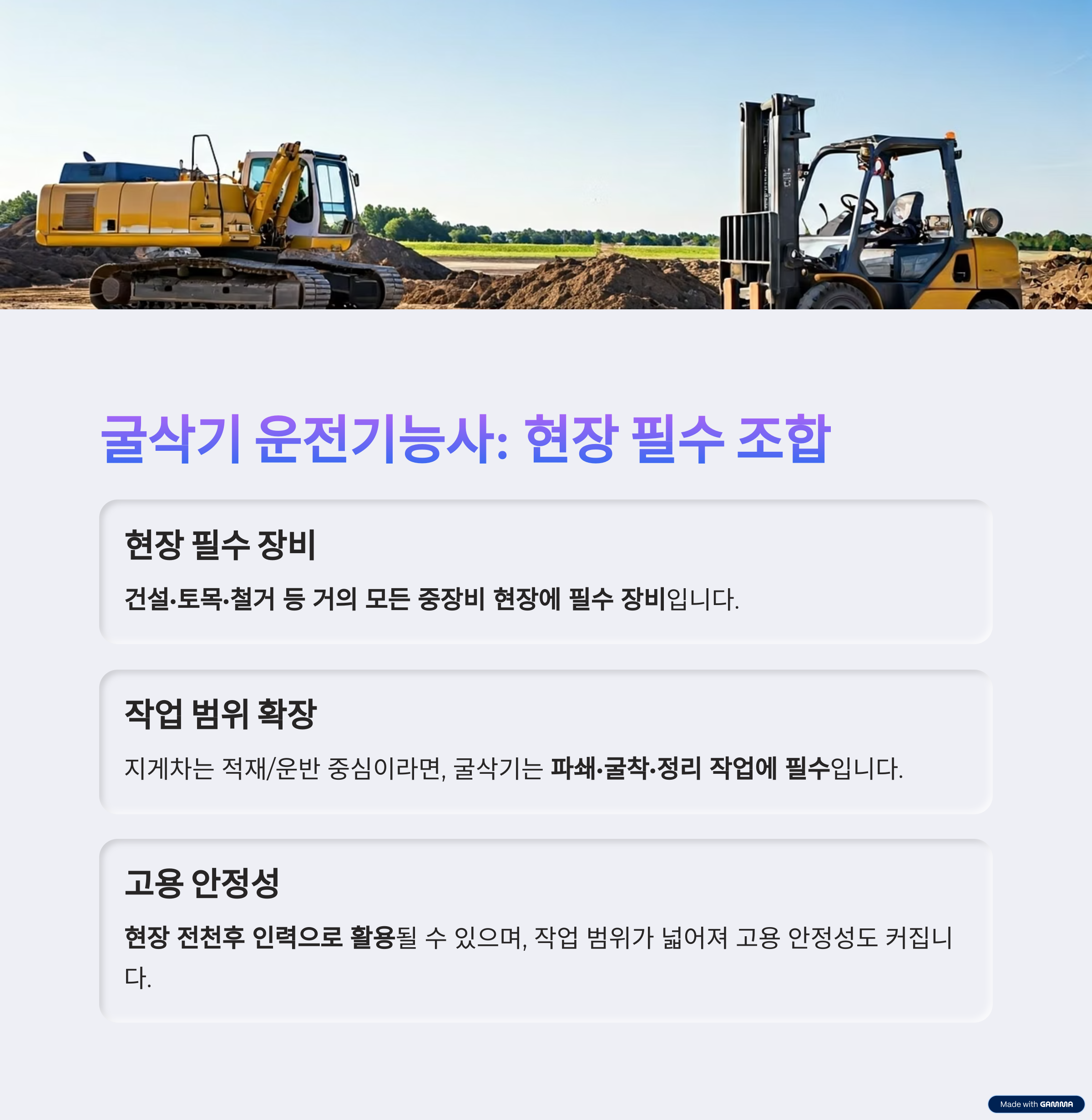 지게차는 적재/운반 중심이라면, 굴삭기는 파쇄·굴착·정리 작업에 필수입니다.