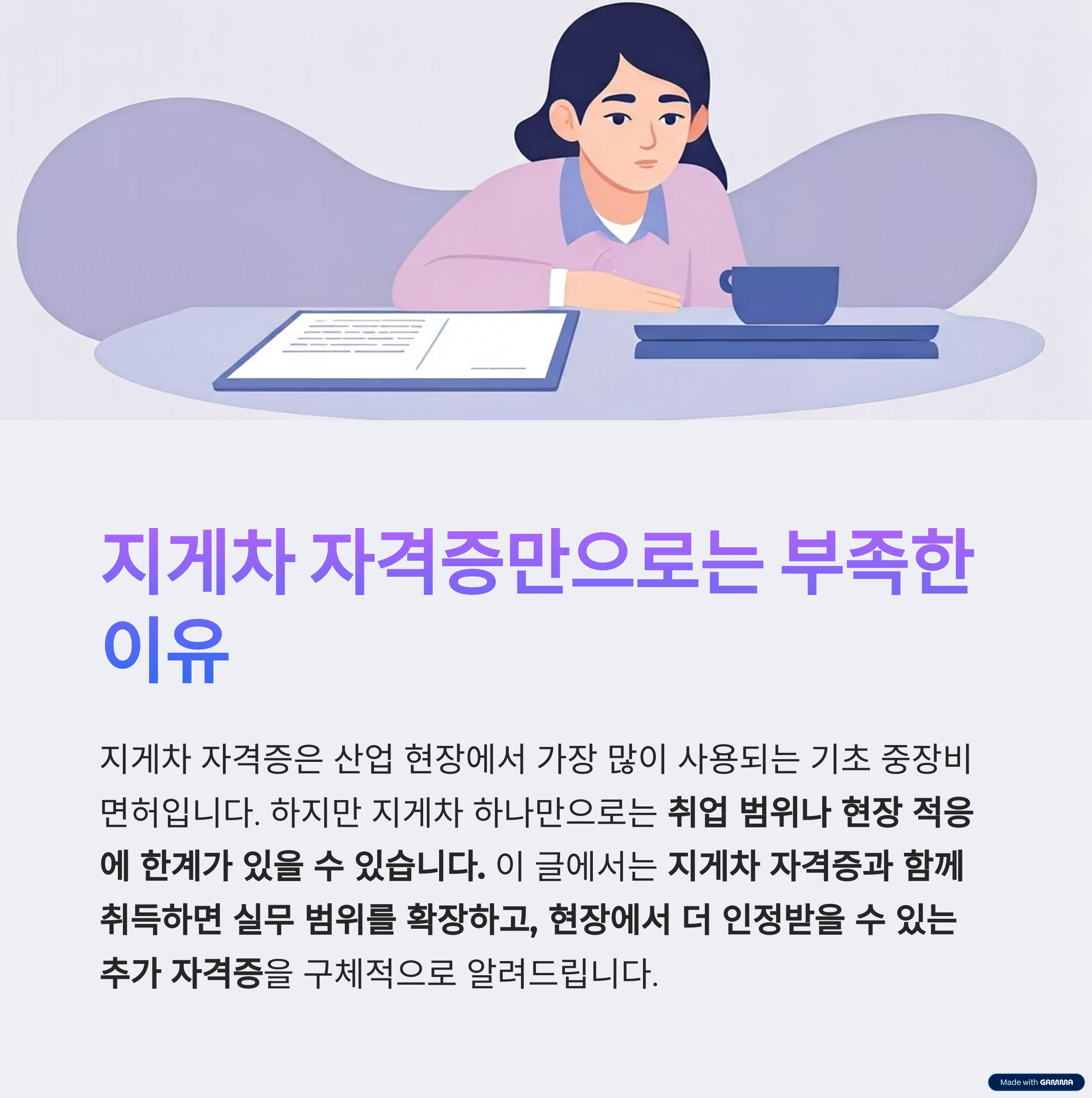 하지만 지게차 하나만으로는 취업 범위나 현장 적응에 한계가 있을 수 있습니다.