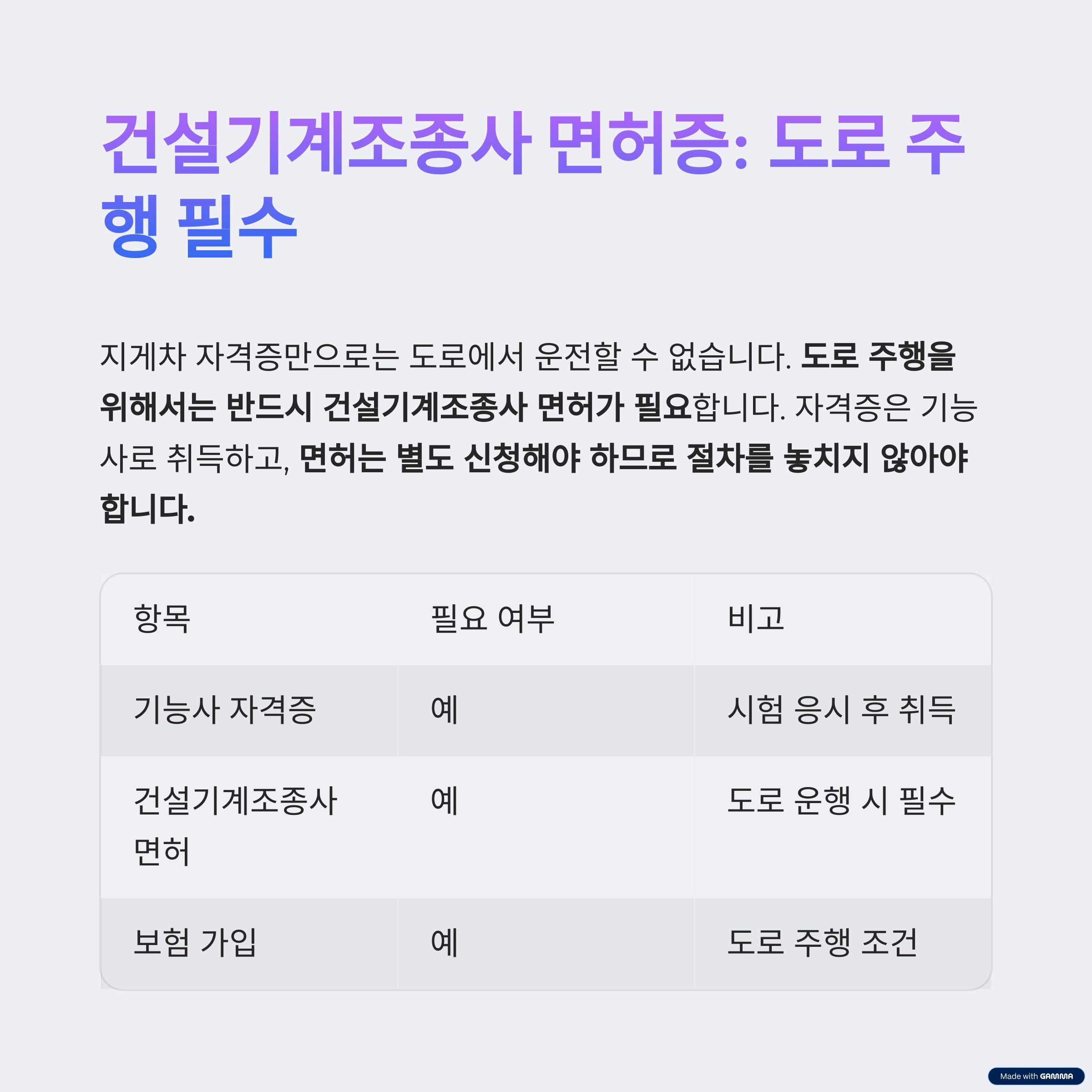 도로 주행을 위해서는 반드시 건설기계조종사 면허가 필요합니다.