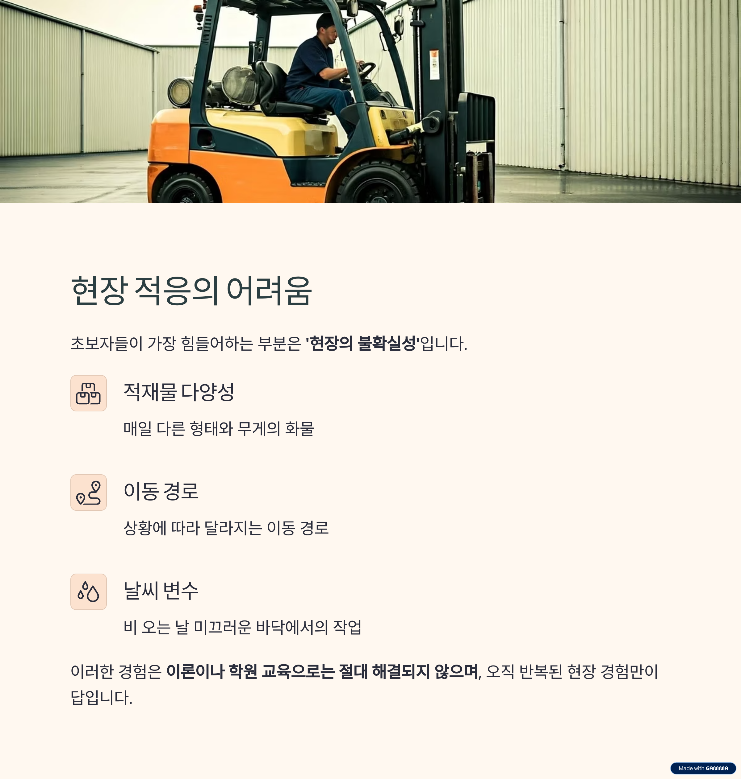 지게차 운전은 단순히 기계를 조작하는 것을 넘어, 현장 이해와 안전 의식을 요구하는 전문 직종입니다.