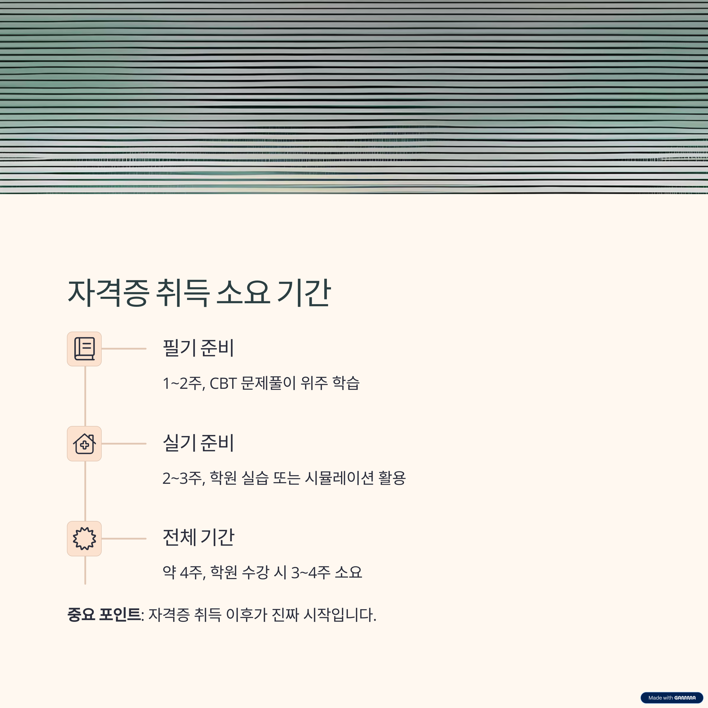 | 실기 준비 | 2~3주 | 학원 실습 또는 시뮬레이션 영상 활용 |