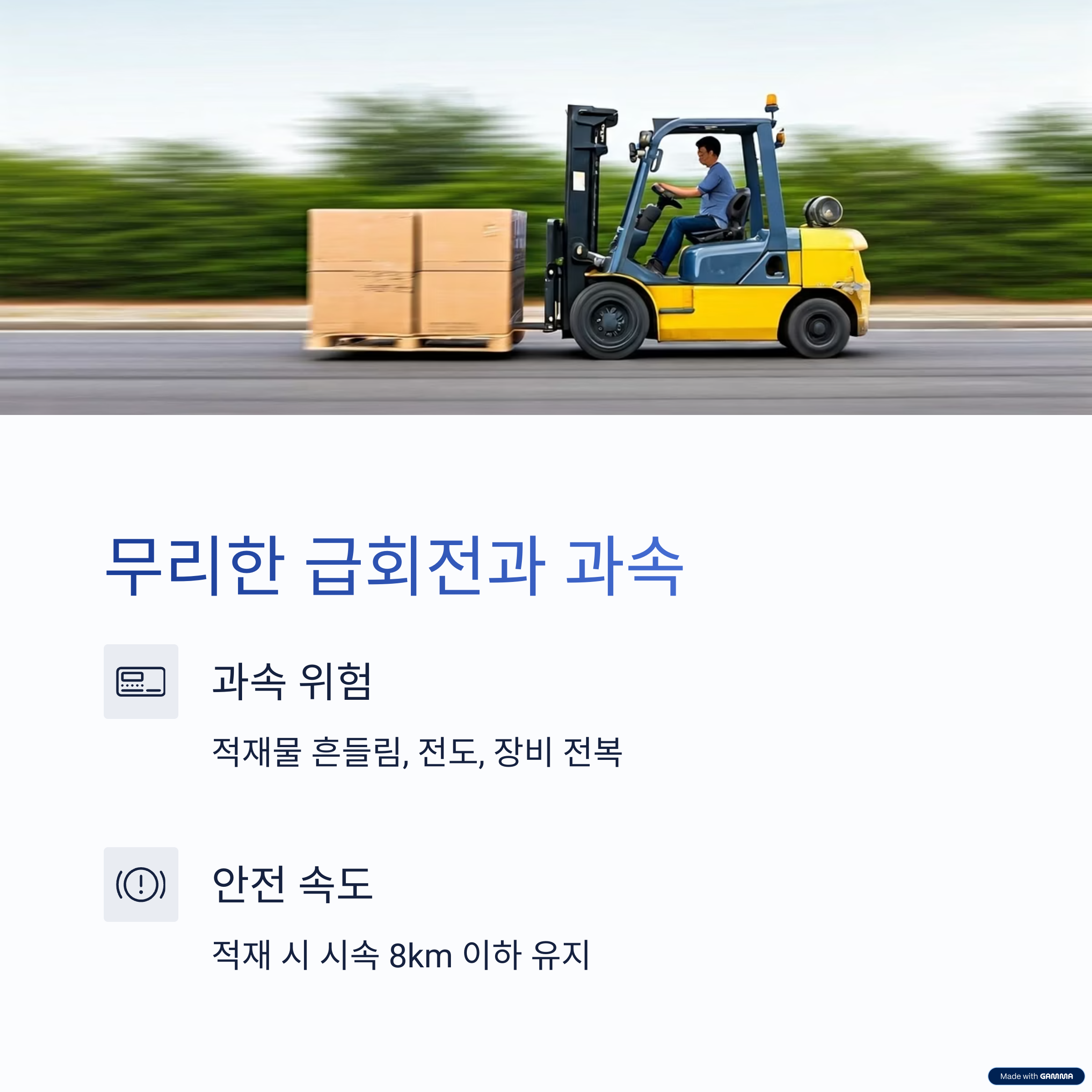 이는 적재물 흔들림 → 전도 → 운전자 추락 또는 장비 전복으로 이어질 수 있습니다.
