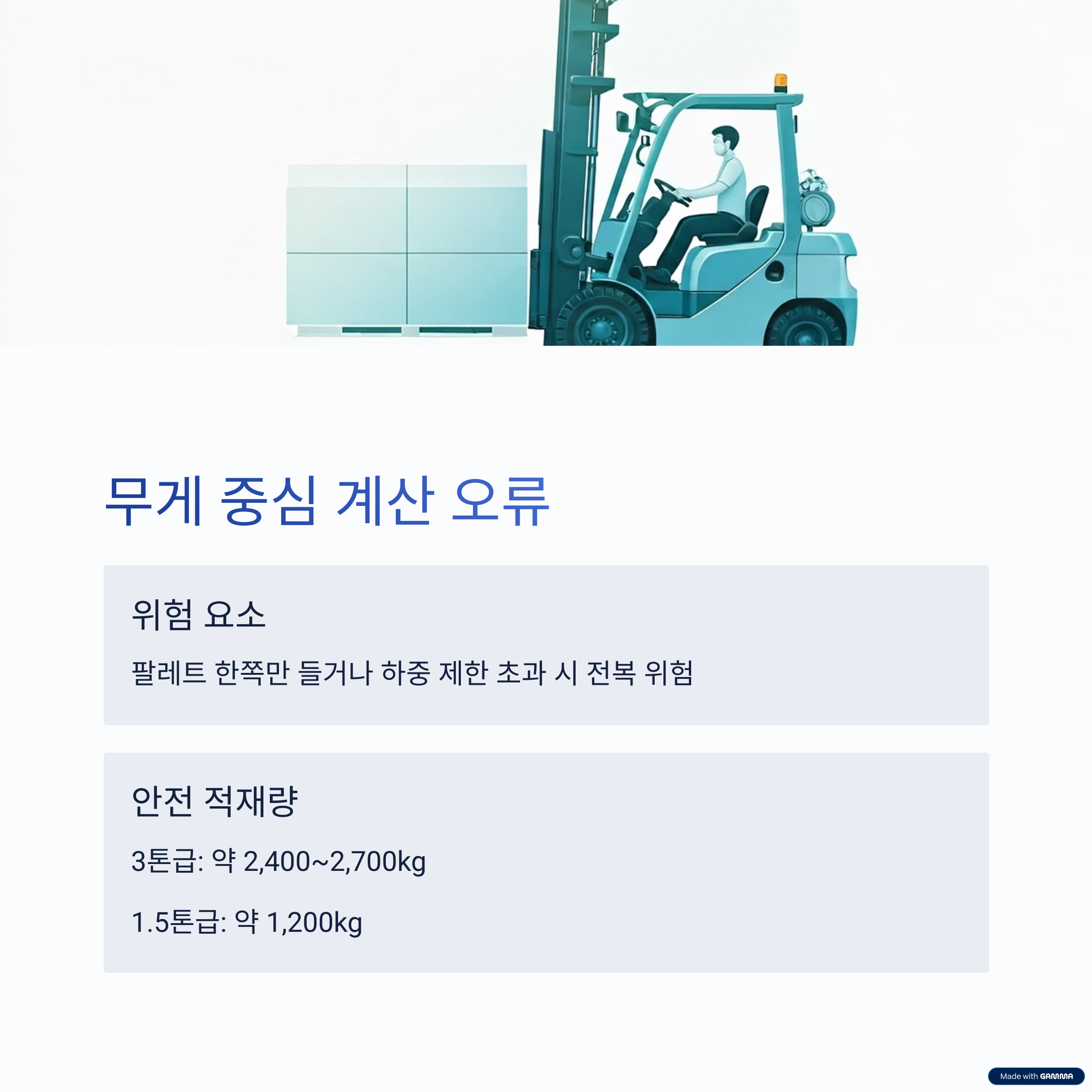 지게차 하중 제한을 넘기는 실수를 자주 합니다.