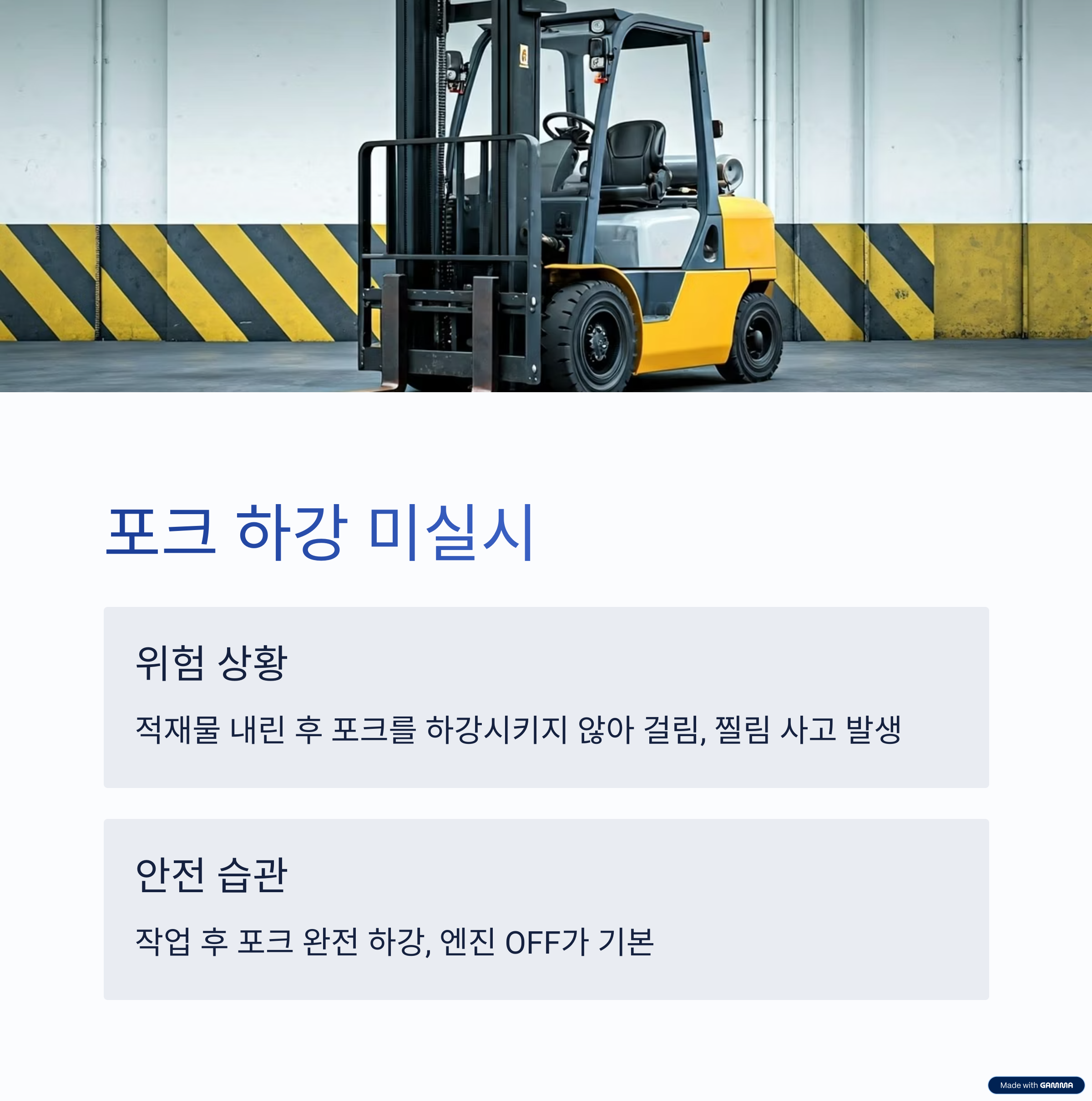 - 퇴근 또는 대기 시에는 엔진 OFF + 포크 완전 하강이 기본