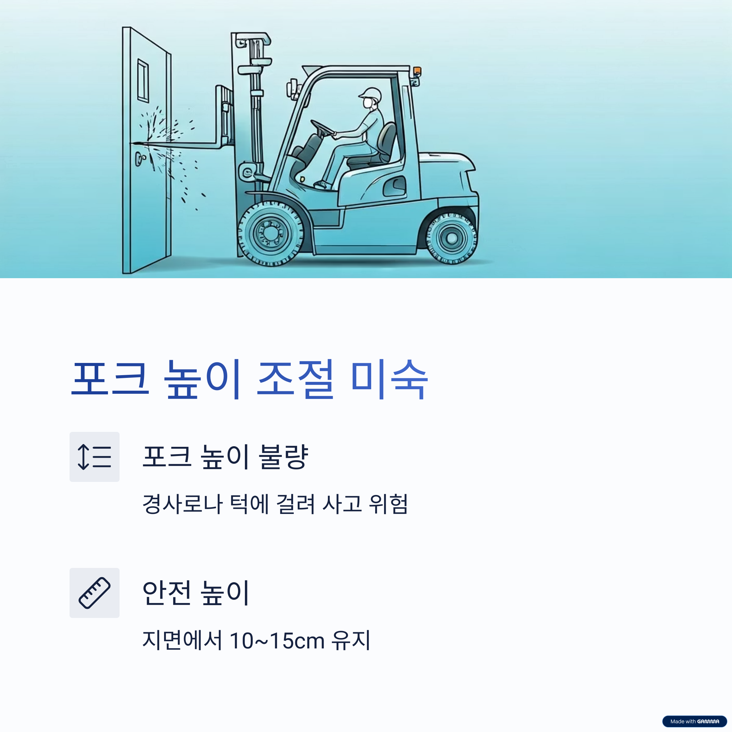 가장 흔한 실수는 포크 높이를 맞추지 않고 전진하거나 후진하는 경우입니다.