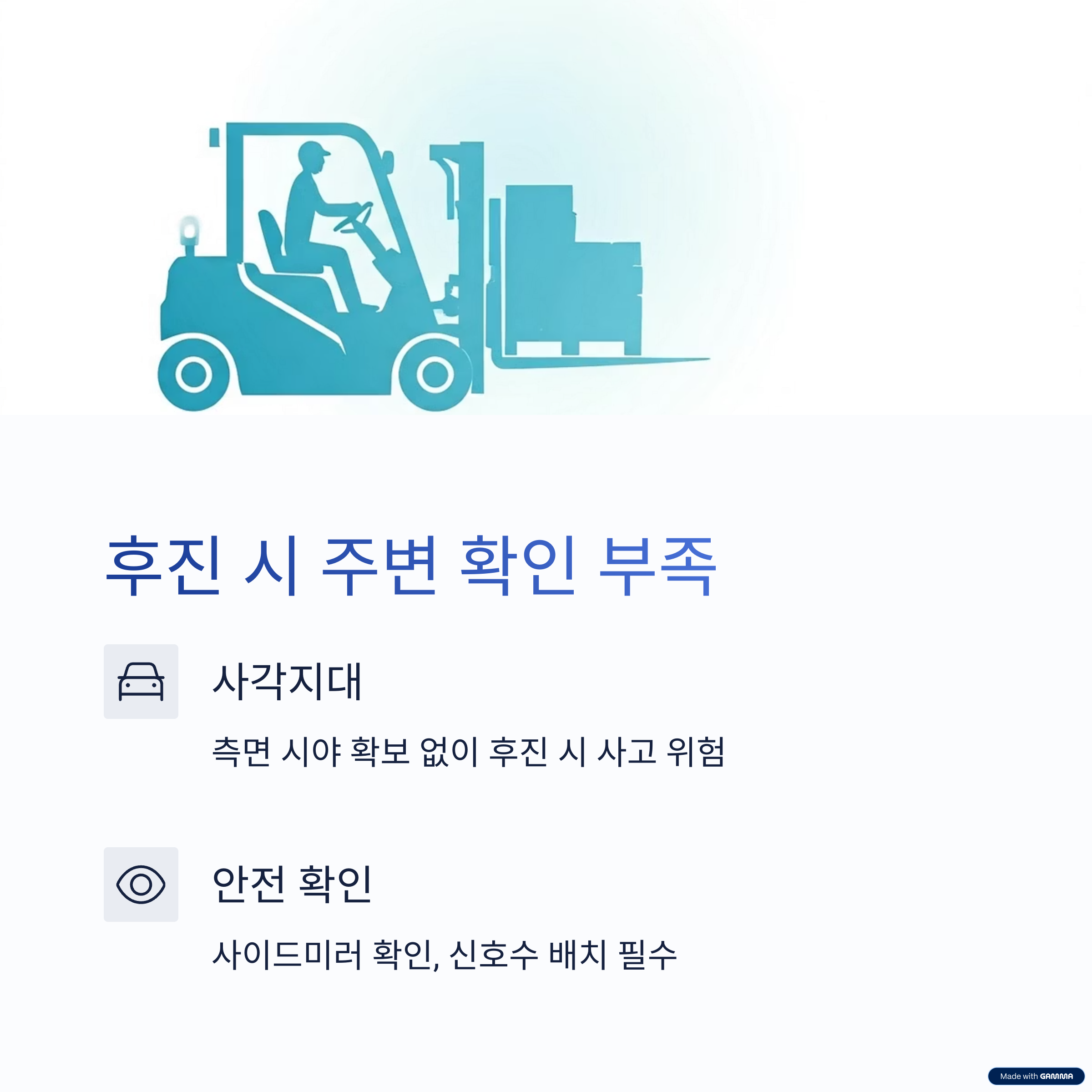 지게차 사고의 상당수는 후진 중 발생합니다.