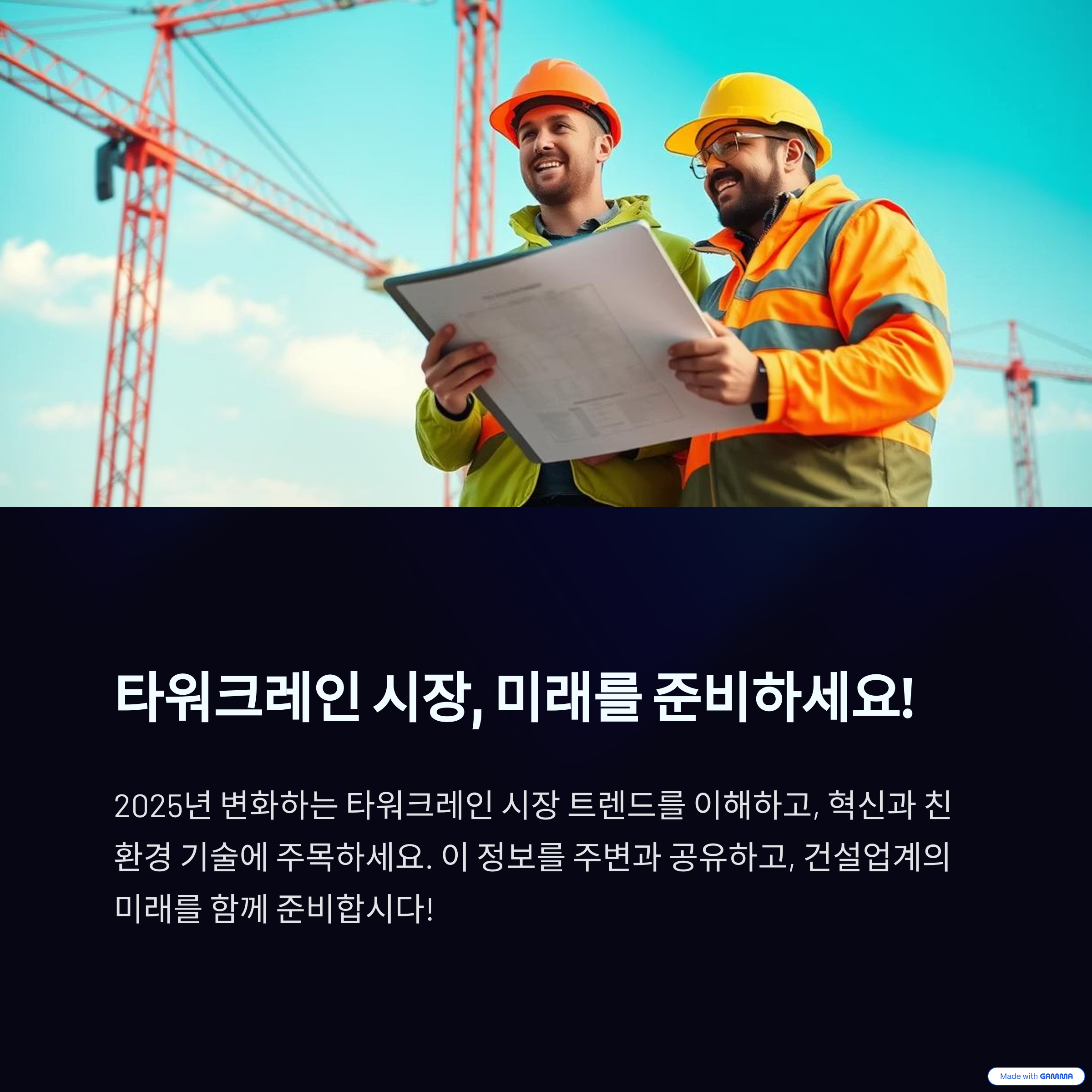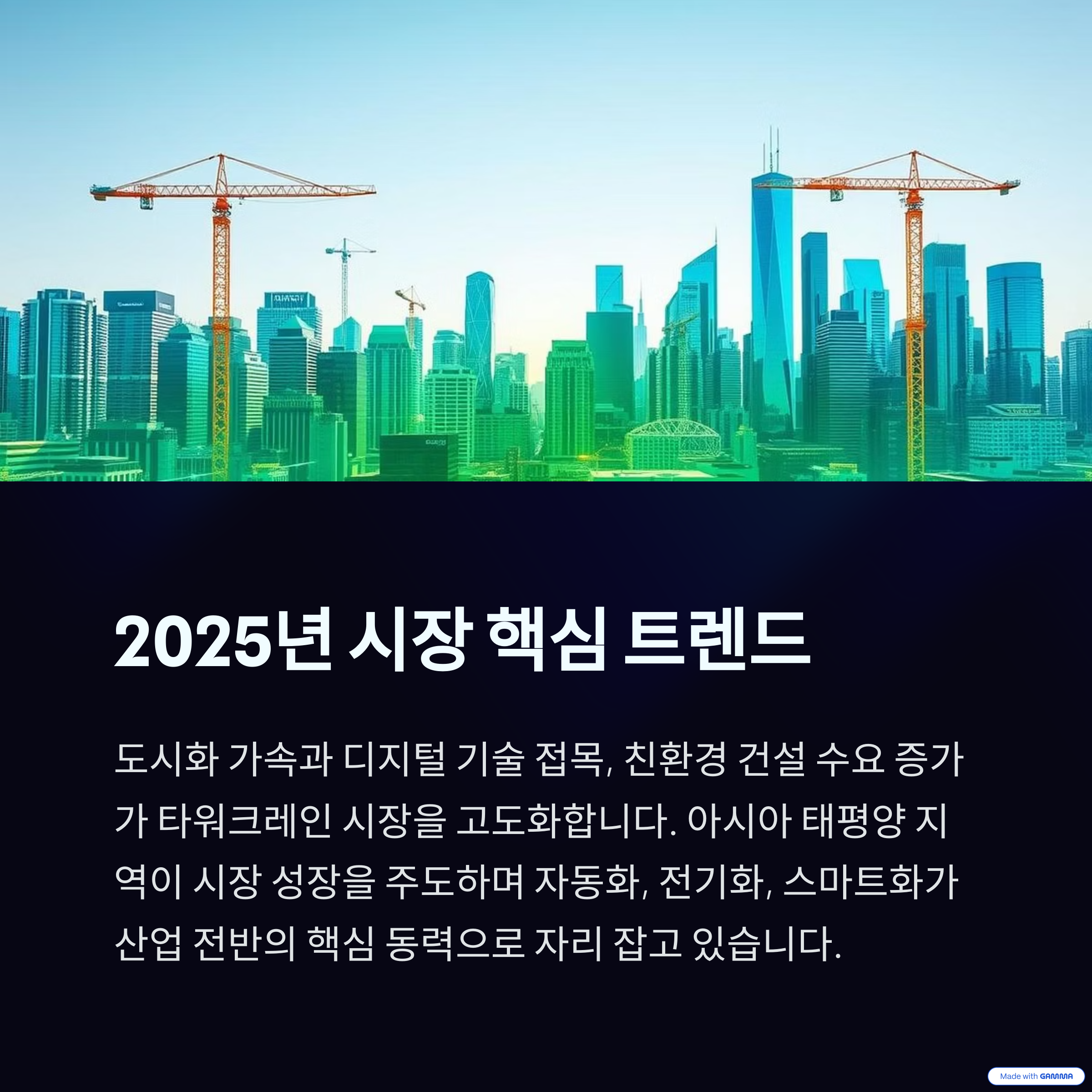 2025년 타워크레인 시장은 도시화 가속, 디지털 기술 접목, 친환경 건설 수요 증가에 따라 고도화된 트렌드가 복합적으로 전개될 전망입니다. 특히 아시아 태평양 지역의 성장과 함께 자동화·전기화·스마트화가 산업 전반을 이끌 핵심 요소로 떠오르고 있습니다.