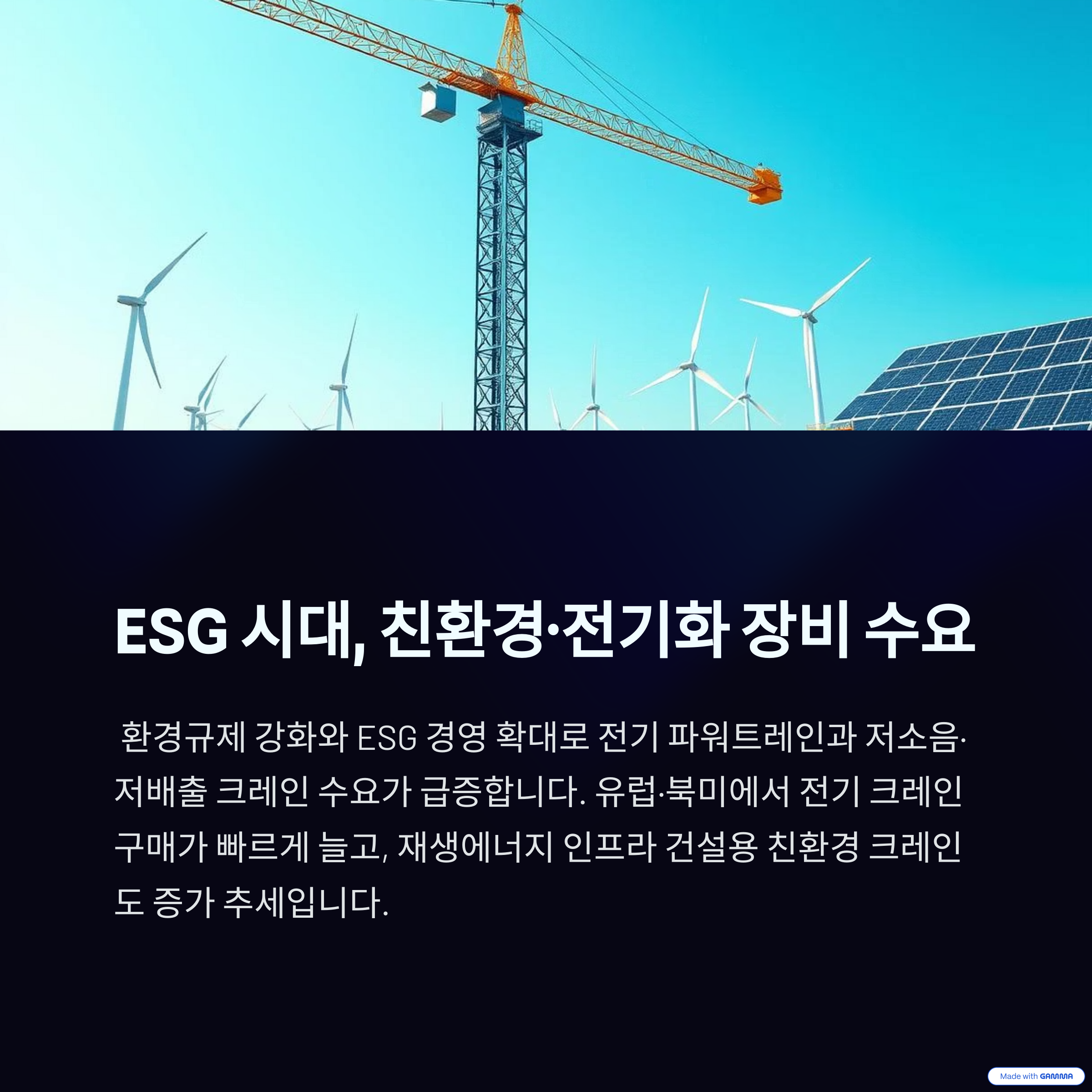 환경규제 강화와 ESG 경영 확대에 따라 전기 파워트레인, 저소음·저배출 크레인에 대한 수요가 급증하고 있습니다.