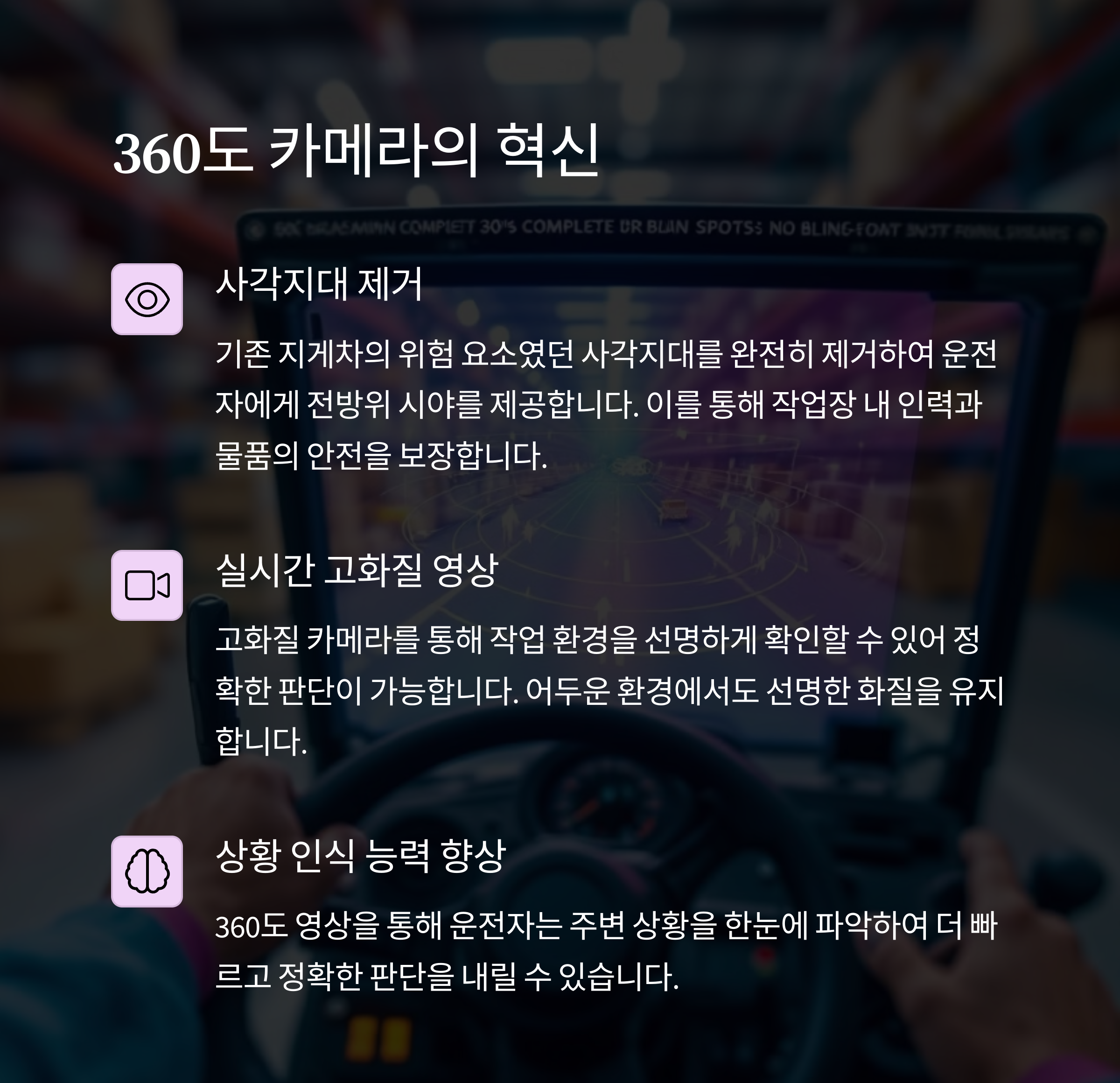 360도 카메라 전방위 시야, 실시간 영상 피드 사각지대 제거, 사고율 70% 감소