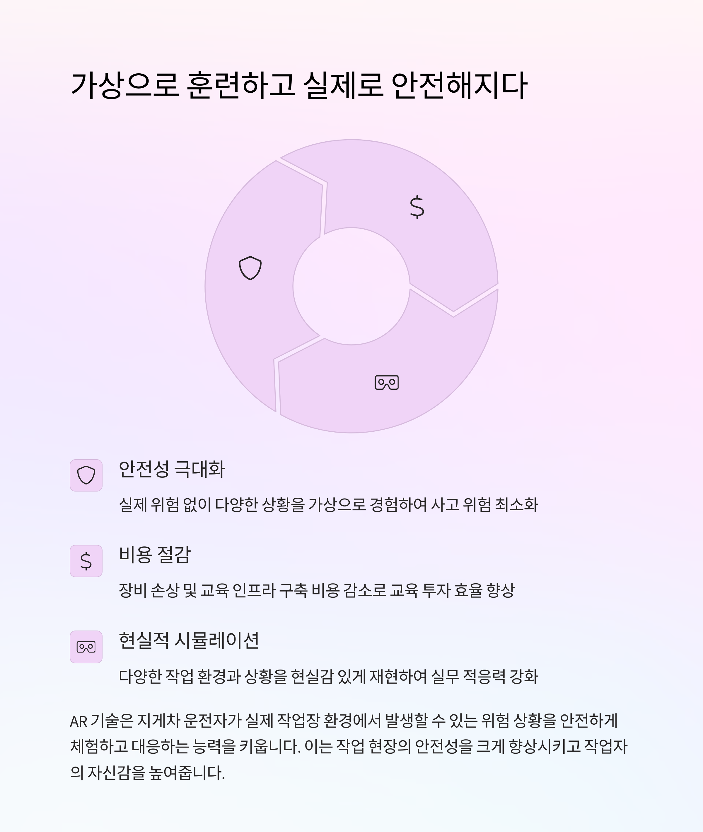 AR 시스템은 실제 작업 환경을 그대로 재현하여 운전자가 현실적인 상황에서 훈련을 받을 수 있도록 합니다. 또한, 실시간 피드백 기능을 통해 작업 수행의 정확성을 향상시키며, 안전 수칙을 철저히 준수하도록 돕습니다.