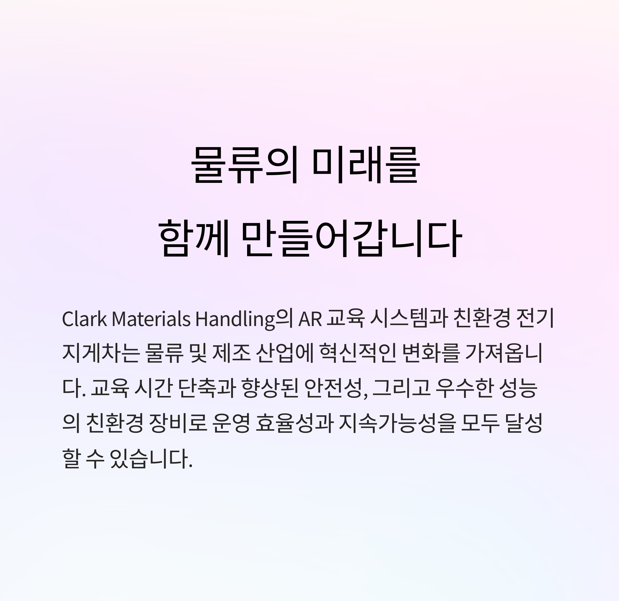 Clark의 AR 기반 지게차 교육 시스템과 신형 전기 지게차는 물류 및 제조 산업의 교육 방식에 혁신을 가져오고 있습니다. 교육 기간을 단축하면서도 안전성과 효율성을 극대화할 수 있으며, AI 알고리즘을 통한 객관적 평가가 가능하여 일정한 기술 수준을 유지할 수 있습니다. 이러한 기술 도입은 장비 운용의 비용 절감생산성 향상에도 기여할 것으로 기대됩니다.