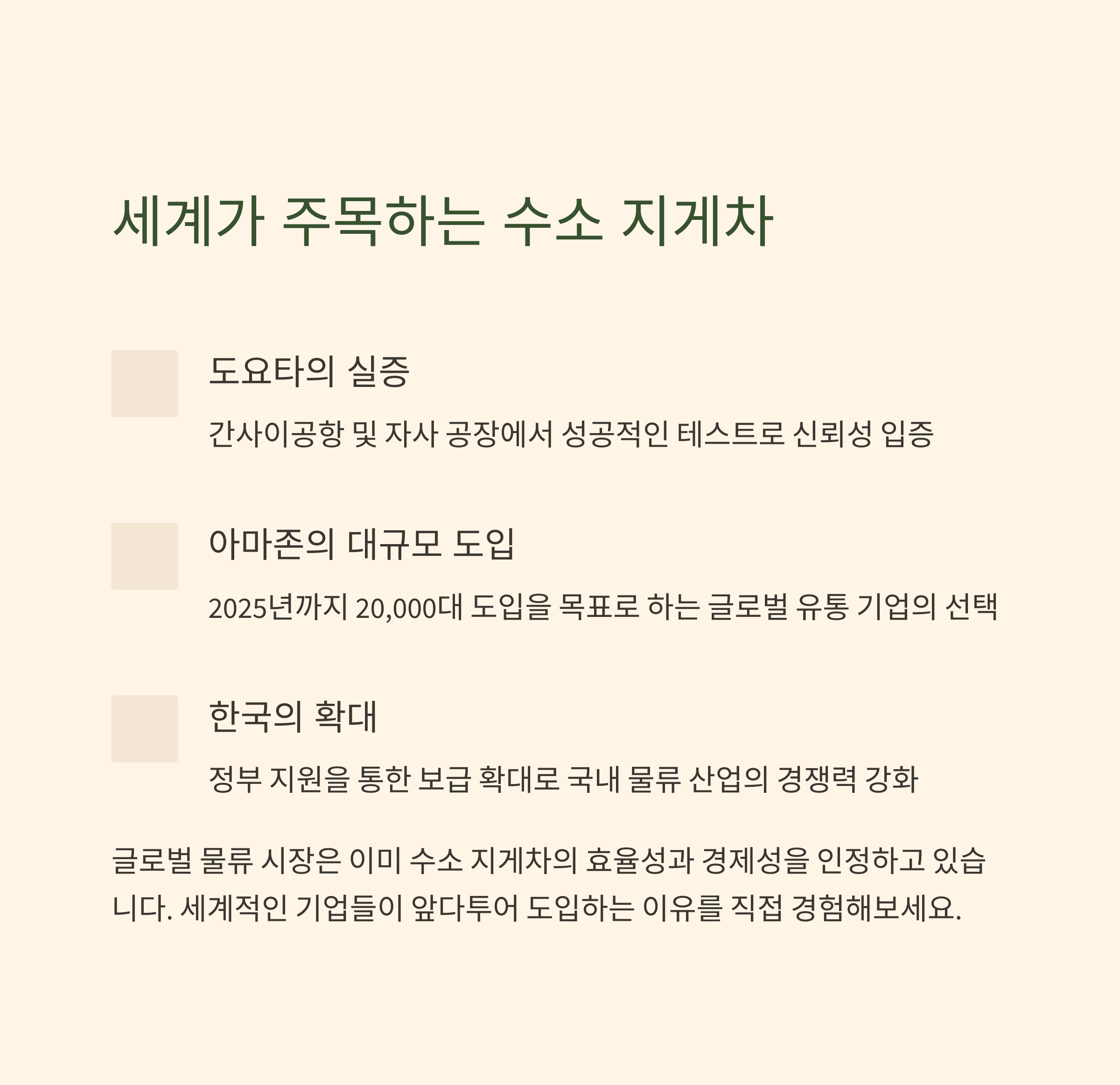 여러분은 수소 지게차의 미래에 대해 어떻게 생각하시나요? 댓글로 여러분의 의견을 공유해주세요!