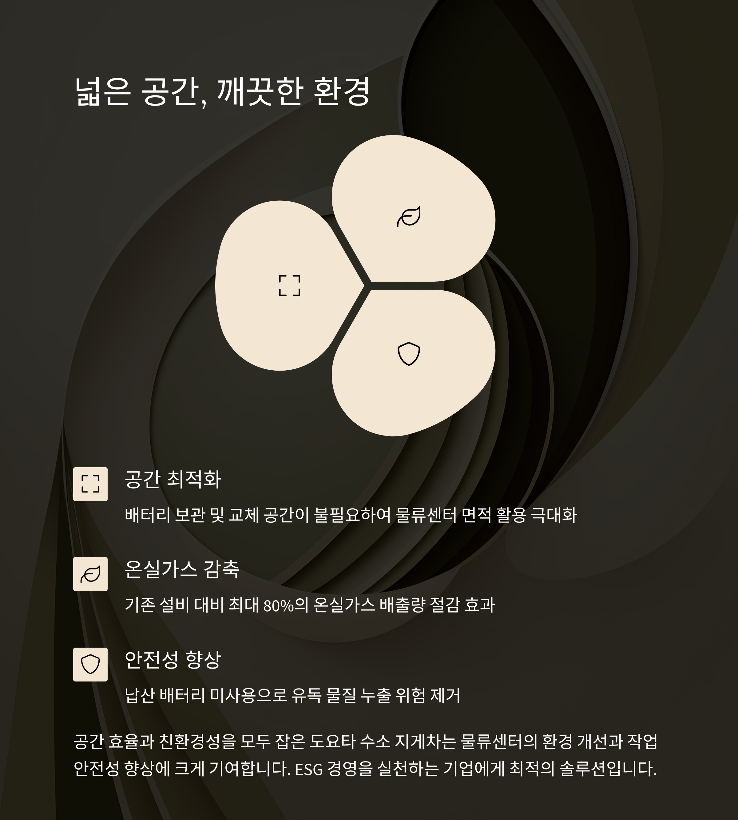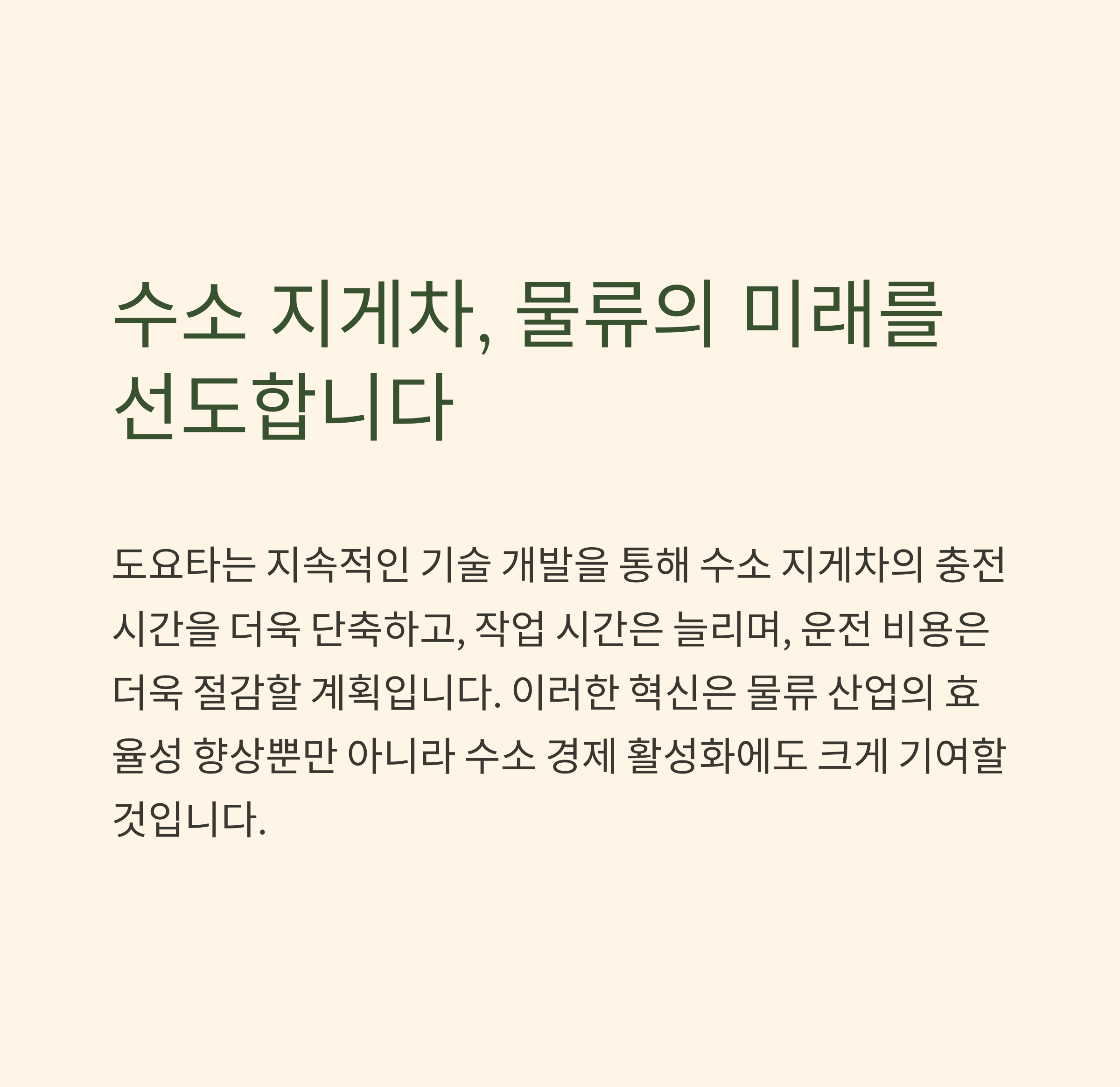 수소 충전소에서 3~5분 만에 급속 충전이 가능합니다. 기존 전기 배터리 충전 방식보다 훨씬 빠르며, 물류센터 운영의 효율성을 높이는 데 기여합니다.