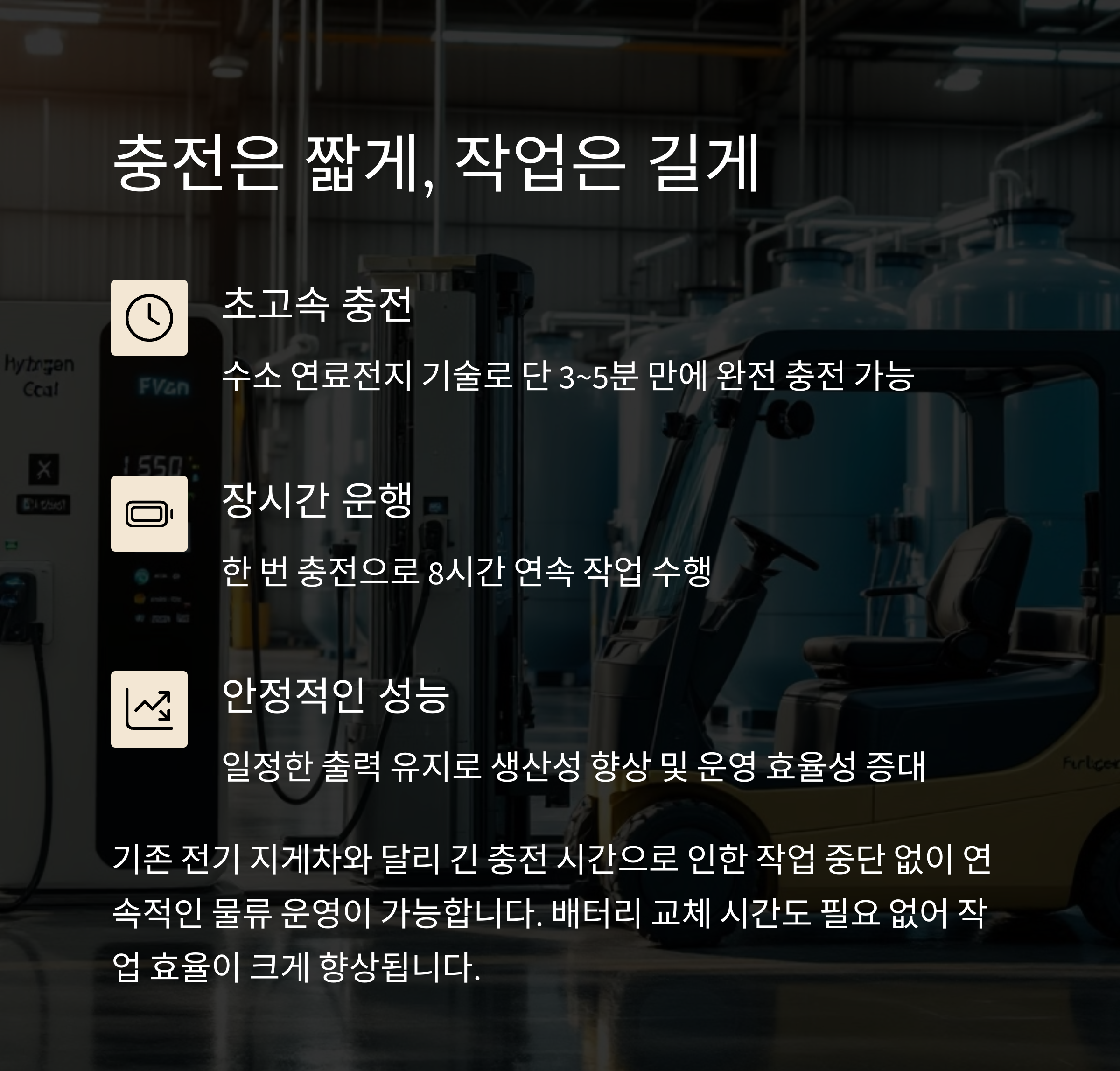 | 3~5분 내 충전 완료 | 8시간 연속 운행 | 무공해, 물만 배출 |
