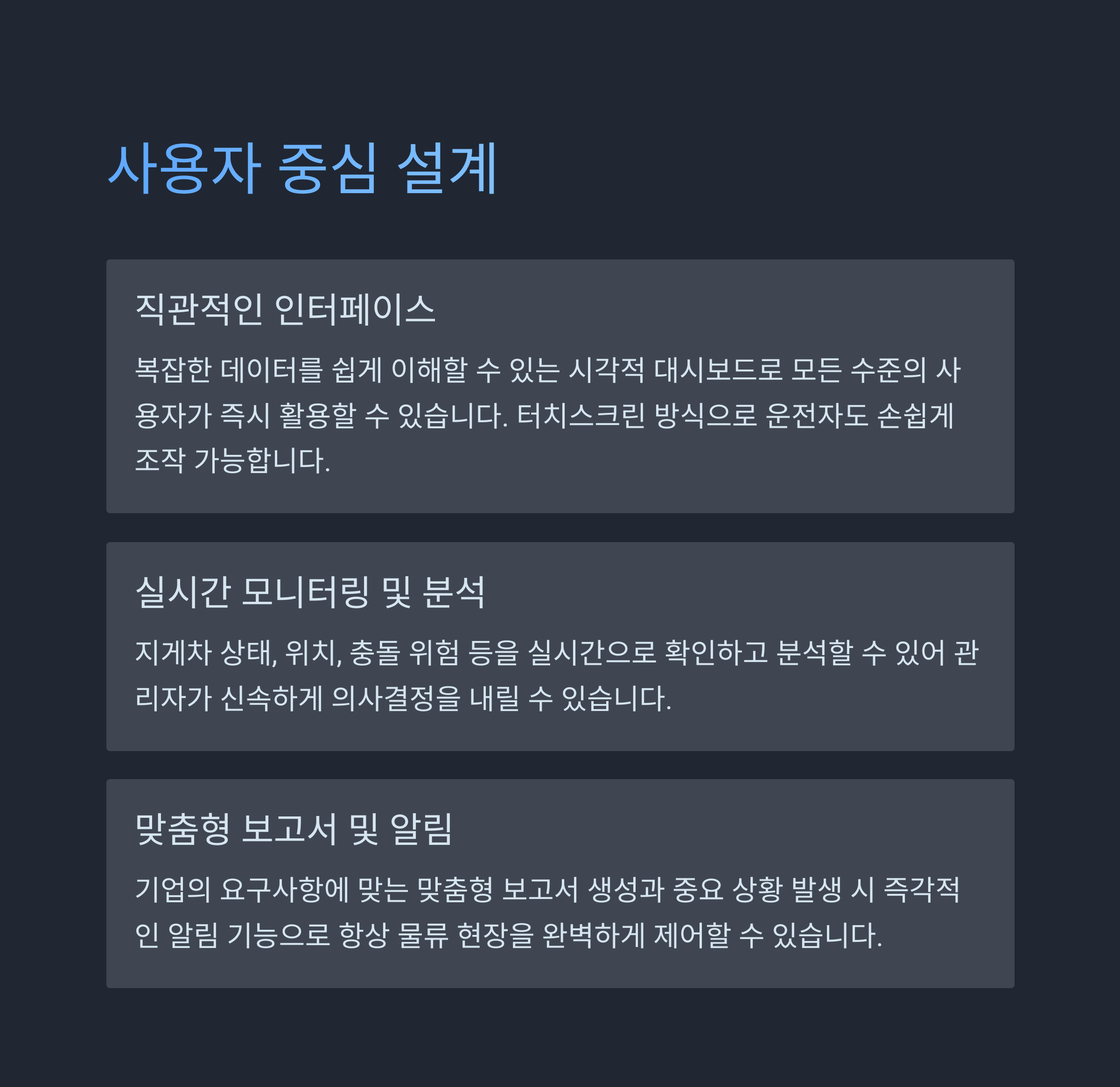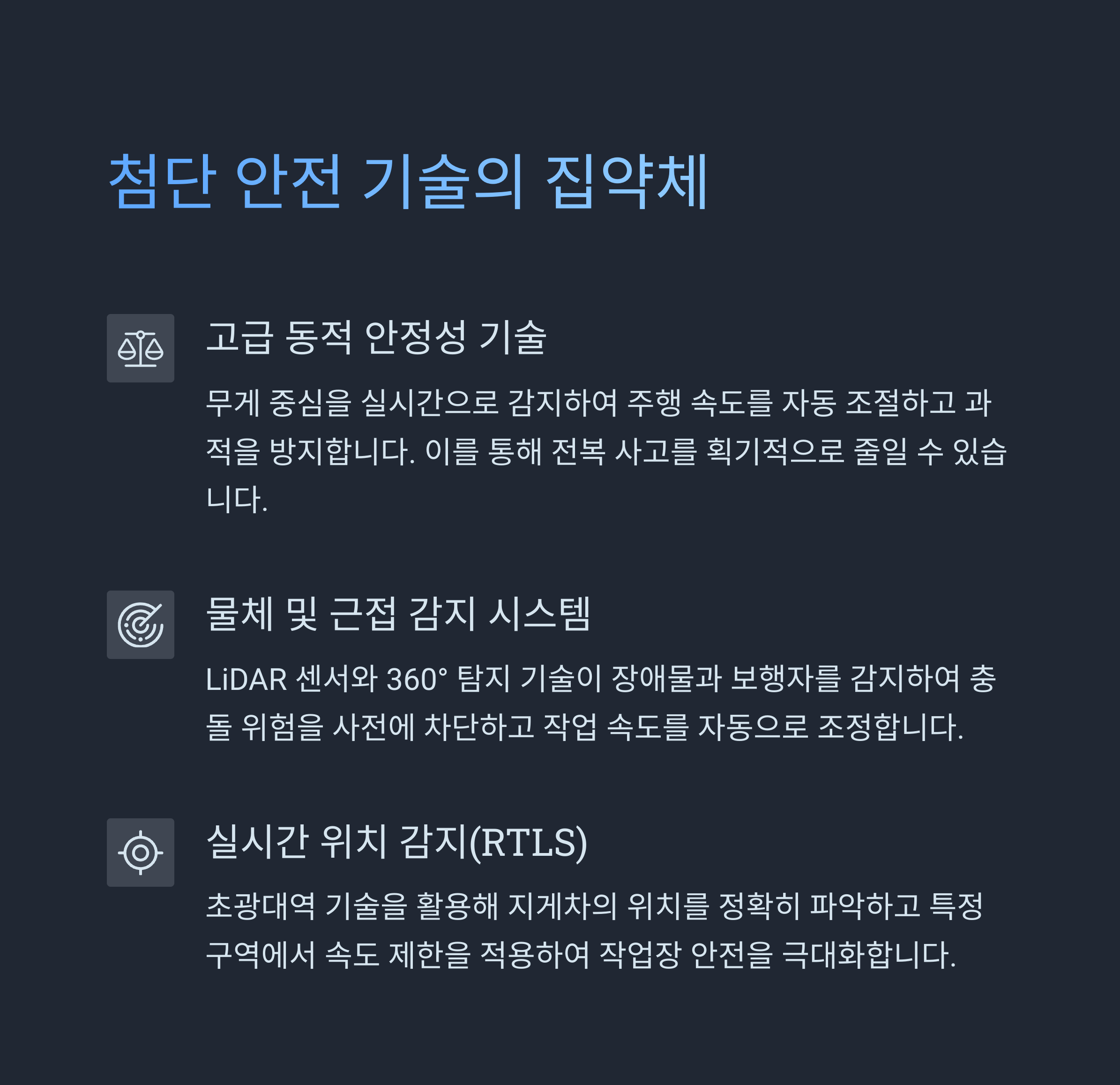이 시스템은 실시간 모니터링자동 개입 기능을 활용하여 지게차 운행 중 발생할 수 있는 위험을 사전에 감지하고, 속도 조절 및 성능 조정으로 사고 가능성을 낮춥니다.