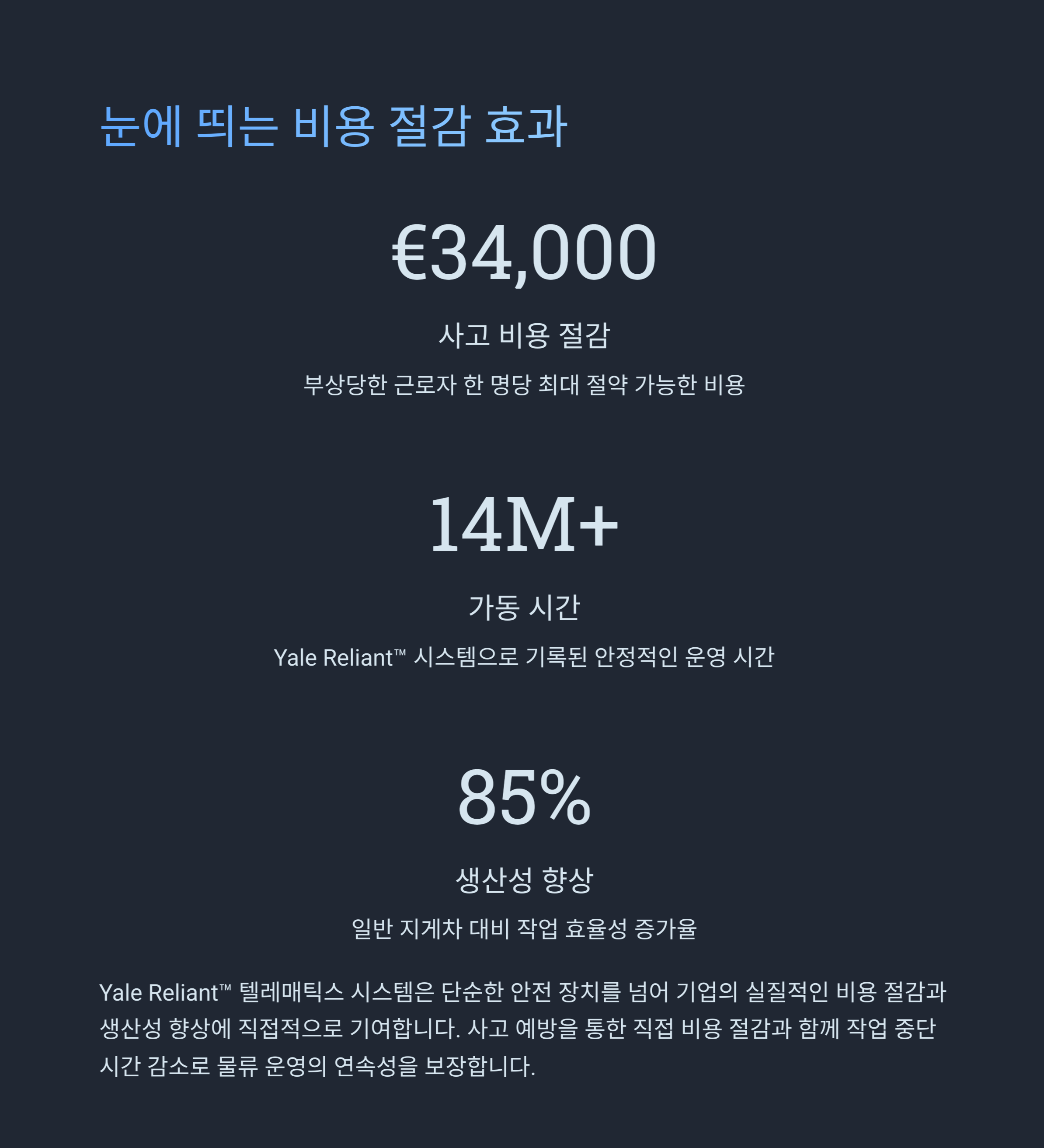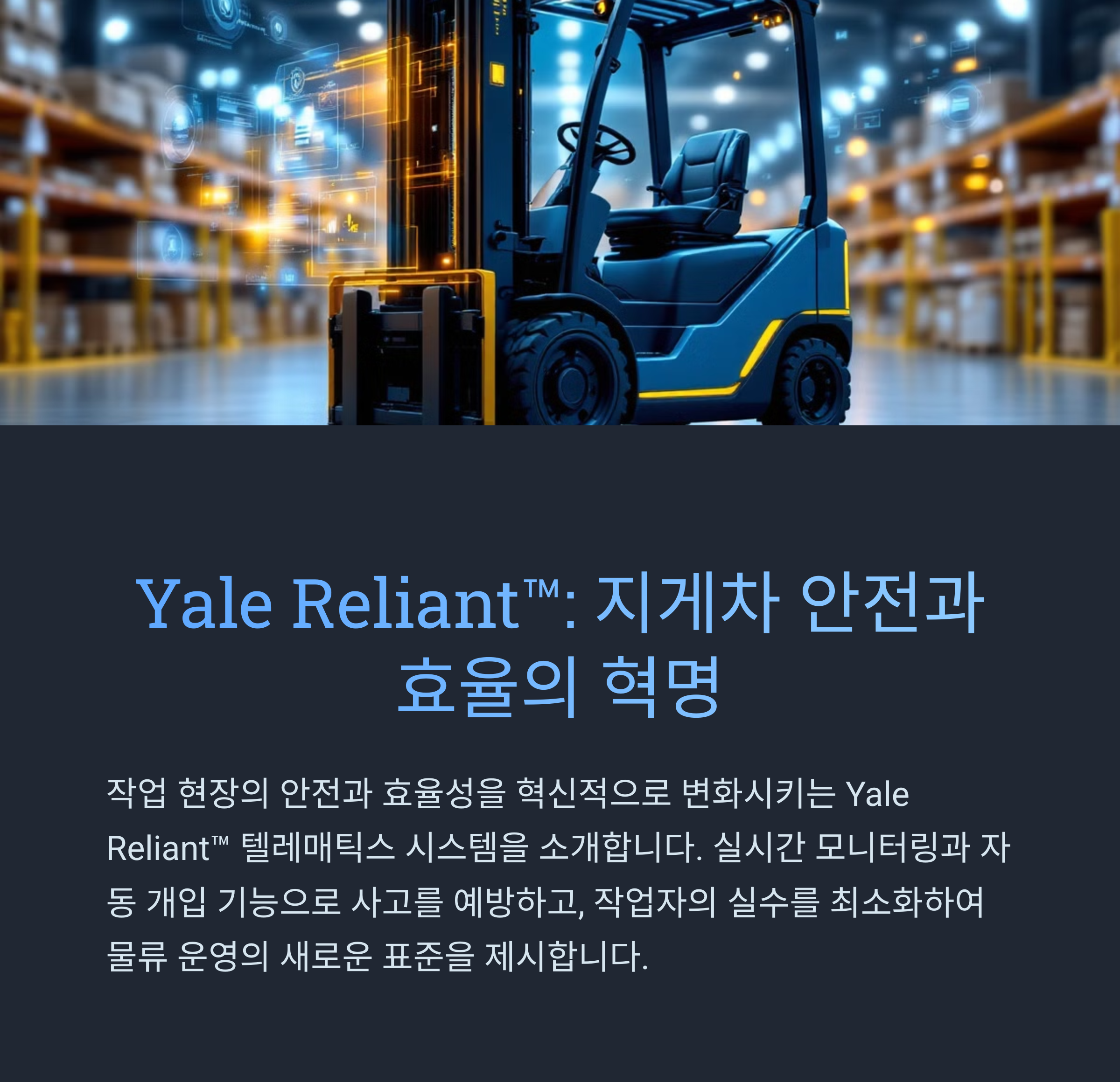 Yale Reliant™ 텔레매틱스 시스템은 단순한 모니터링을 넘어 실시간 위험 감지 및 자동 개입을 통해 작업자의 실수를 최소화하고 더 안전한 작업 환경을 조성합니다. 이를 통해 생산성을 높이고 운영 비용을 절감할 수 있어, 물류 산업의 미래를 위한 필수 솔루션으로 자리 잡고 있습니다.