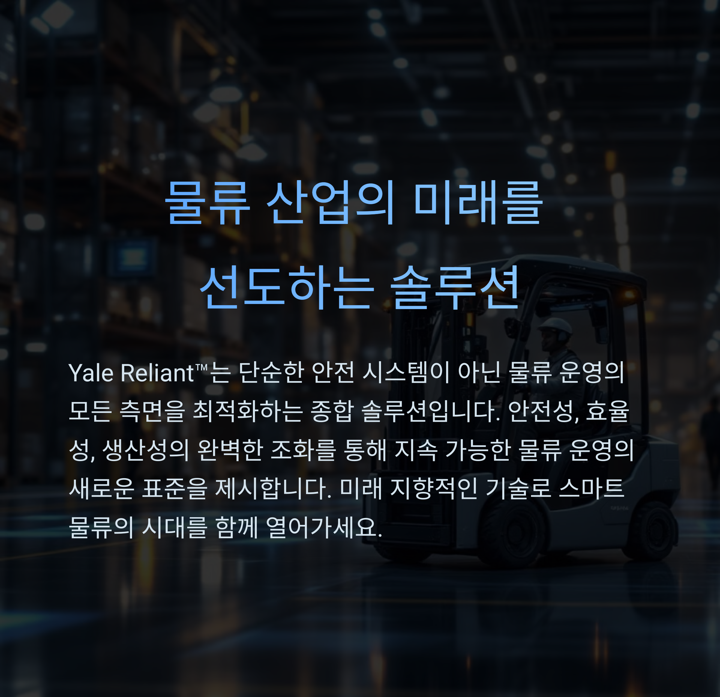 Yale Reliant™ 텔레매틱스 시스템은 실시간 데이터 분석과 자동 개입 기능을 통해 창고 환경에서의 안전성을 획기적으로 개선합니다. 이를 통해 작업자의 실수를 줄이고, 효율성을 극대화할 수 있습니다. 점점 더 스마트해지는 물류 환경에서, Yale Reliant™는 미래 물류 혁신의 중심에 자리 잡고 있습니다.